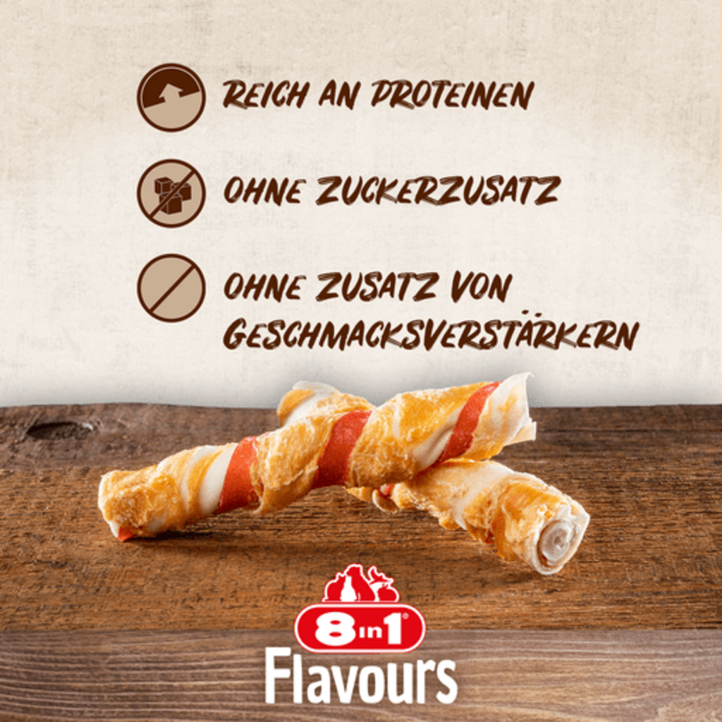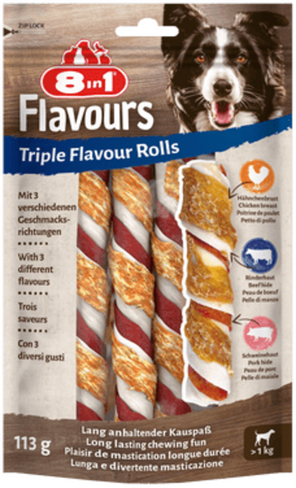 Les Triple Flavour Rolls de 8in1 sont un vrai régal pour les papilles ! Ces rouleaux à mâcher sont une friandise de rêve faite de délicieuses peaux de porc et de bœuf, enrobées d'une poitrine de poulet juteuse et tendre. Ces rouleaux à mâcher ne se distinguent pas seulement par leur goût savoureux, ils sont également une aide à la bonne santé dentaire de votre chien : grâce à l'effet abrasif de la mastication, elles luttent durablement contre le tartre et la plaque dentaire.