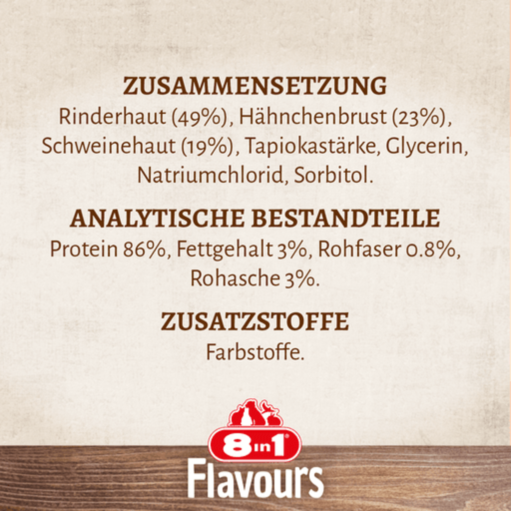 49 % Peau de bœuf, 23 % Blanc de poulet, 19 % Peau de porc, Tapioca, glycérine, Chlorure de sodium, Sorbitol
