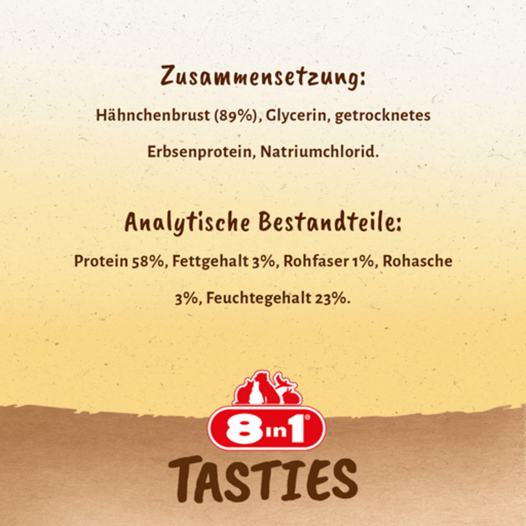 Délicieux, irrésistibles... les Tasties Chicken Breast de 8in1 ! Ces récompenses bénies contiennent un savoureux blanc de poulet très riche en protéines ! Cette friandise riche en protéines est facile à digérer, ne contient pas de sucres ajoutés et est pauvre en matières grasses. Cuite au four, elle ne contient pas de gluten, d'exhausteurs de goût, d'organismes génétiquement modifiés, de conservateurs artificiels ni de colorants. Tout simplement délicieux !