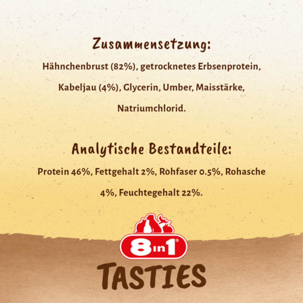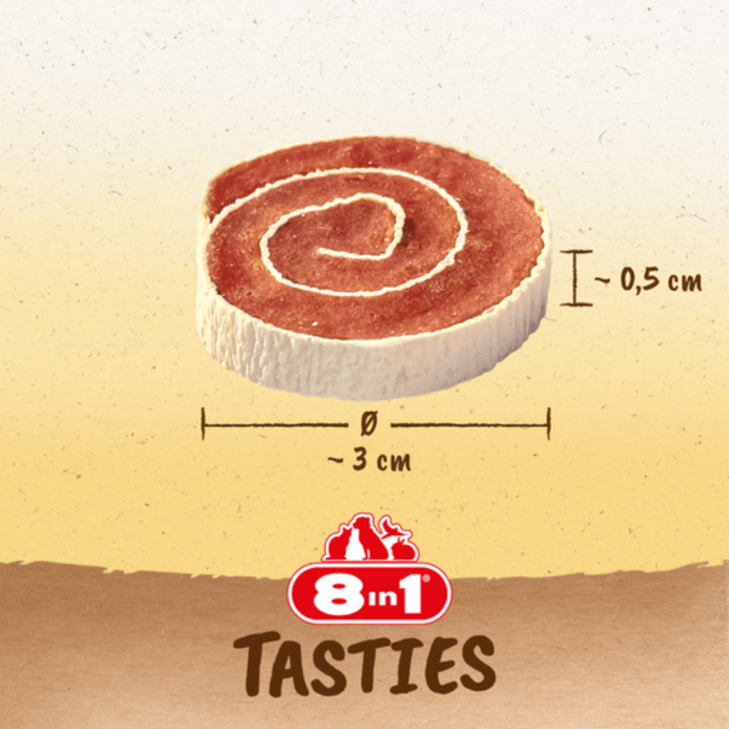 Délicieux, irrésistibles... les Tasties Sushi Rolls de 8in1 ! Ces récompenses bénies contiennent un savoureux blanc de poulet entourée de cabillaud, prenant la forme de sushis ! Cette friandise riche en protéines est facile à digérer, ne contient pas de sucres ajoutés et est pauvre en matières grasses. Cuite au four, elle ne contient pas de gluten, d'exhausteurs de goût, d'organismes génétiquement modifiés, de conservateurs artificiels ni de colorants. Tout simplement délicieux !
