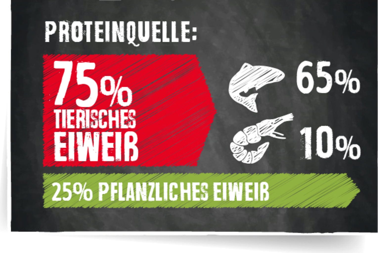 40 % saumon frais, 17 % farine de poisson de mer, 16 % amarante, fécule de pomme de terre, farine de pois, Zooplancton marin moulu, huile de saumon, tourteau de pépins de raisin, levure de bière inactivée et séchée, farine de caroube séchée, saumon hydrolysé, graines de chia, phosphate dicalcique, herbes séchées, chlorure de sodium, Kaliumchlorid, Yucca schidigera