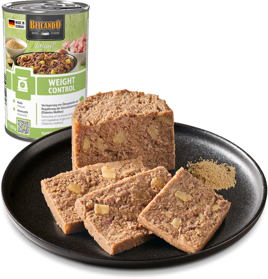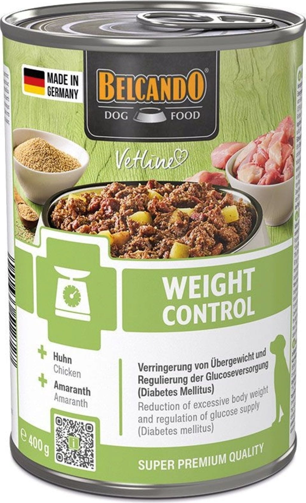 Si votre chien lutte contre le surpoids et/ou le diabète sucré, une alimentation adaptée constitue un élément important pour améliorer sa qualité de vie. Avec Vetline Weight Control de BELCANDO, vous offrez à votre chien une nourriture humide spécialement développée pour les régimes amaigrissants, sans renoncer au goût. Grâce à des ingrédients de haute qualité tels que le poulet frais, l’amarante et des fibres de pomme rassasiantes, cet aliment est facilement accepté même par les palais les plus exigeants. Votre animal de compagnie peut ainsi profiter de chaque journée en se sentant plein de vitalité et satisfait.