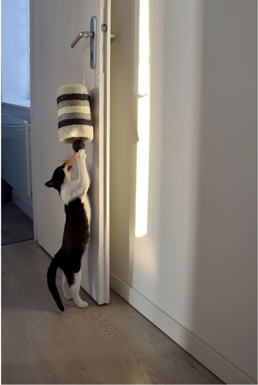Ce rouleau compact est conçu pour être suspendu et se place partout. Recouvert de corde de papier recyclé résistant aux griffures, il présente également de la peluche appréciée des chats. Des plumes véritables à l'extrémité stimulent l'instinct naturel de chasse et de jeu du chat, qui peut ainsi s'amuser tout seul.