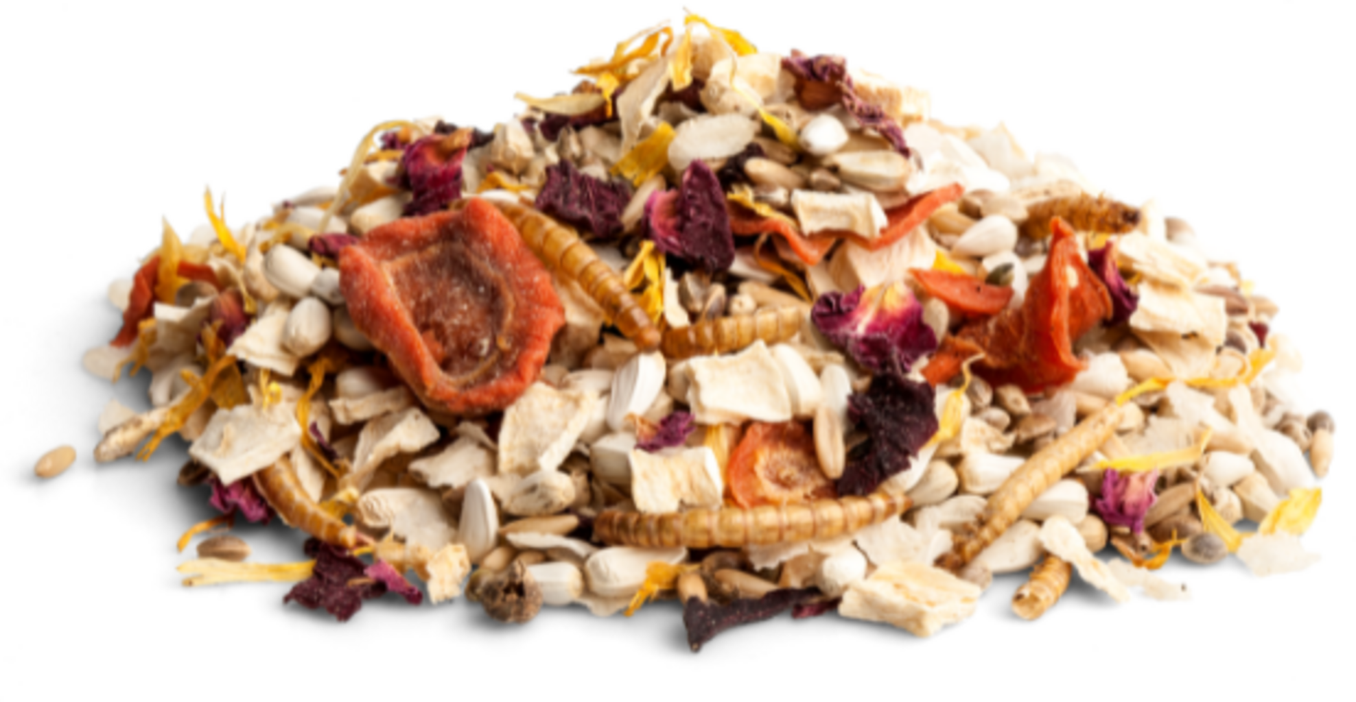 Kardisaat, Reisflocken, graines de chanvre, graines d'avoine, panais, Karotten, 5 % Haselnuss, betterave, ténébrion meunier, pétales de rose, fleurs de souci (70 % graines)