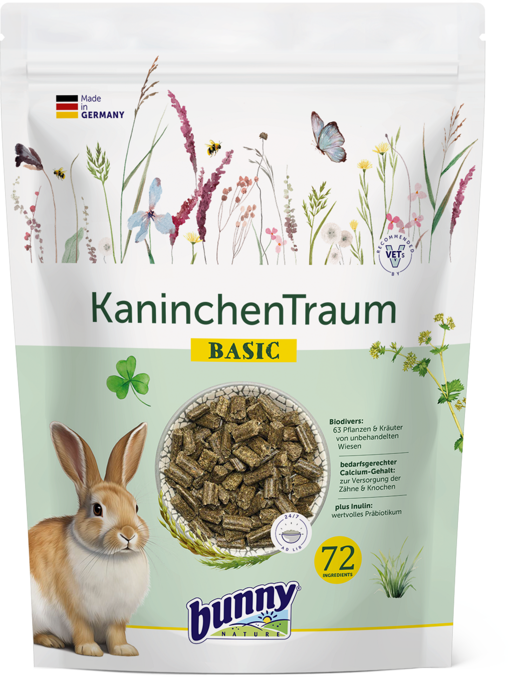 Quand les rêves des lapins deviennent réalité… cet aliment savoureux n’en est vraiment pas loin ! Avec 63 plantes différentes issues de prairies non traitées et de la précieuse inuline, il offre dès le départ une délicieuse diversité et permet une alimentation de grande qualité, parfaitement adaptée aux besoins des jeunes lapins nains.