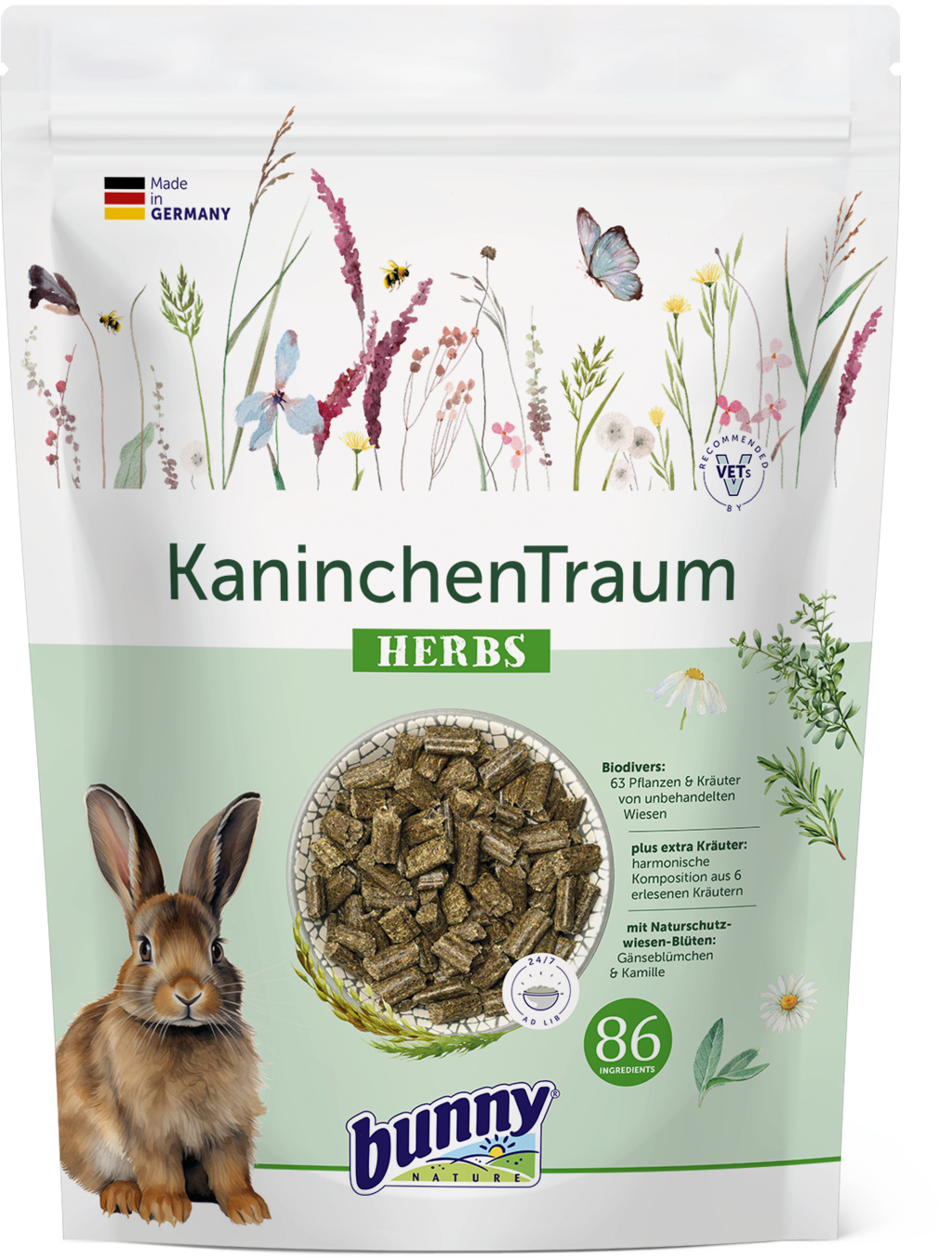 Quand les rêves des lapins deviennent réalité… cet aliment savoureux n’en est vraiment pas loin ! Avec 63 plantes différentes issues de prairies non traitées et de la précieuse inuline, il offre dès le départ une délicieuse diversité et permet une alimentation de grande qualité, parfaitement adaptée aux besoins des jeunes lapins nains.