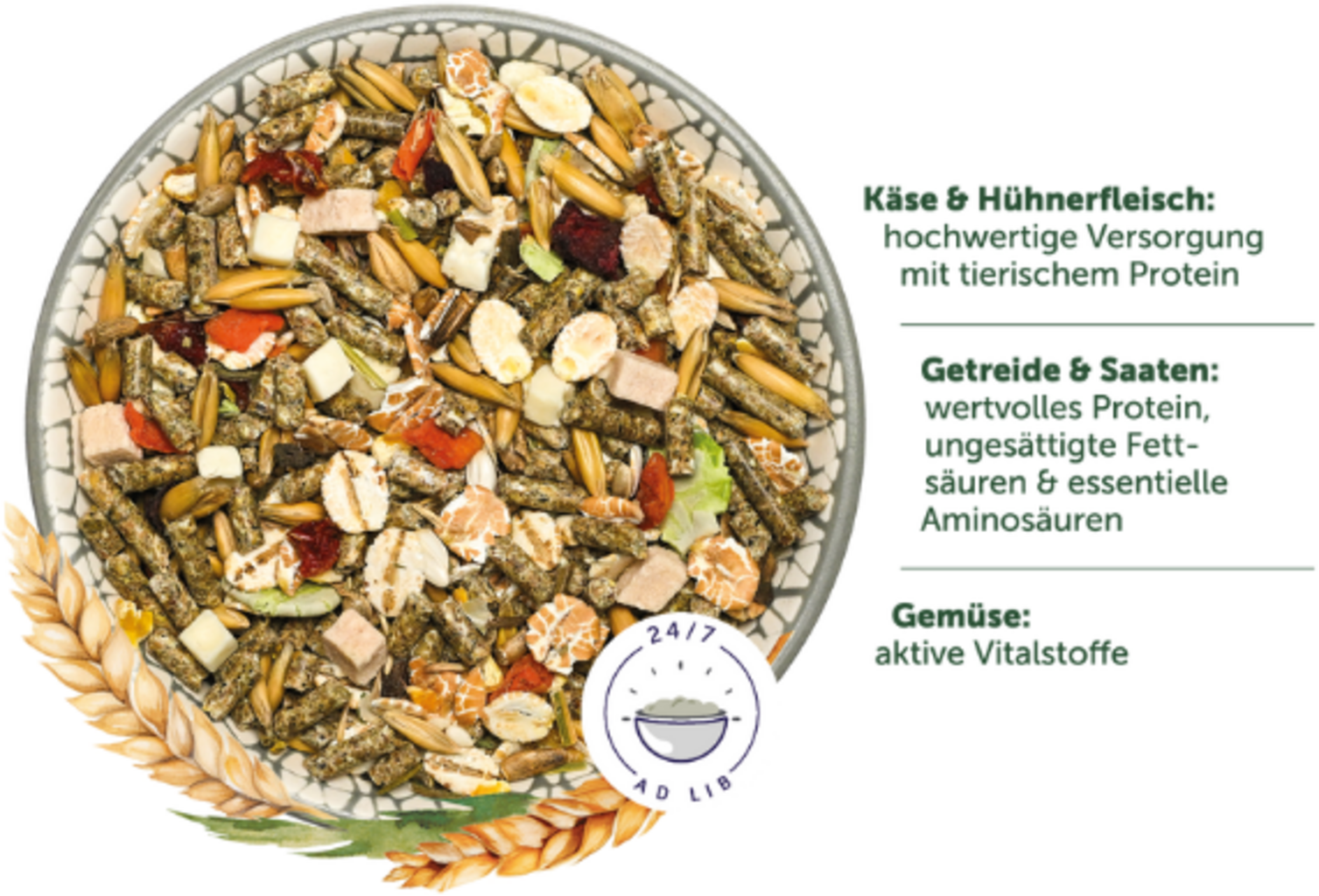 avoine, flocons d'orge, millet commun, flocons de petits pois, orge, son de blé, flocons de blé, tourteau d'extraction de tournesol, blé, maïs, maïs concassé, millet argenté, graines de chanvre, farine d'herbe de luzerne, millet rouge, graines de tournesol, carbonate de calcium, 1 % poivron, 1 % carottes, graines de chardon-marie, sarrasin, carthame, alpiste des Canaries, drêche de bière, semences de gazon, graines de lin, marc de carotte, Levure de bière inactivée séchée, luzerne, feuilles de plantain, graines de sésame, 0,5 % viande de poulet séchée, 0,5 % fromage sec, inuline de chicorée , graines d'avoine, Äpfel, betterave, camomille sauvage, protéines de pomme de terre, caroube (56 % céréales, 20 % graines, 10 % légumes)