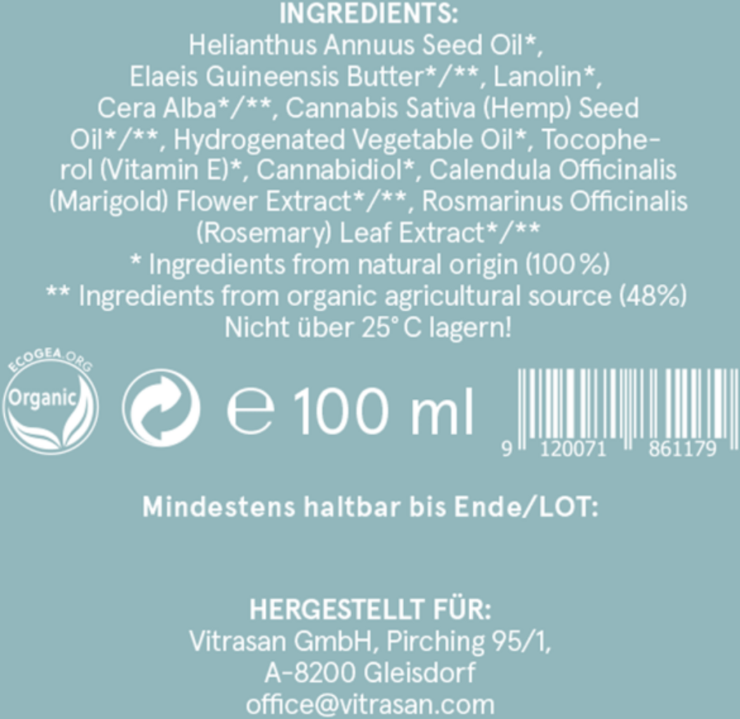 Helianthus Annuus (Sunflower) Seed Oil[1], Elaeis Guieensis Butter[2], Lanolin[1], Cera Alba (Beeswax)[2], Cannabis Sativa (Hemp) Seed Oil[2], Hydrogenated Vegetable Oil[1], Tocopherol[1], Cannabidiol (Cbd)[1], Calendula Officinalis Flower Extract[2], Rosmarinus Officinalis (Rosemary) Extract[2]