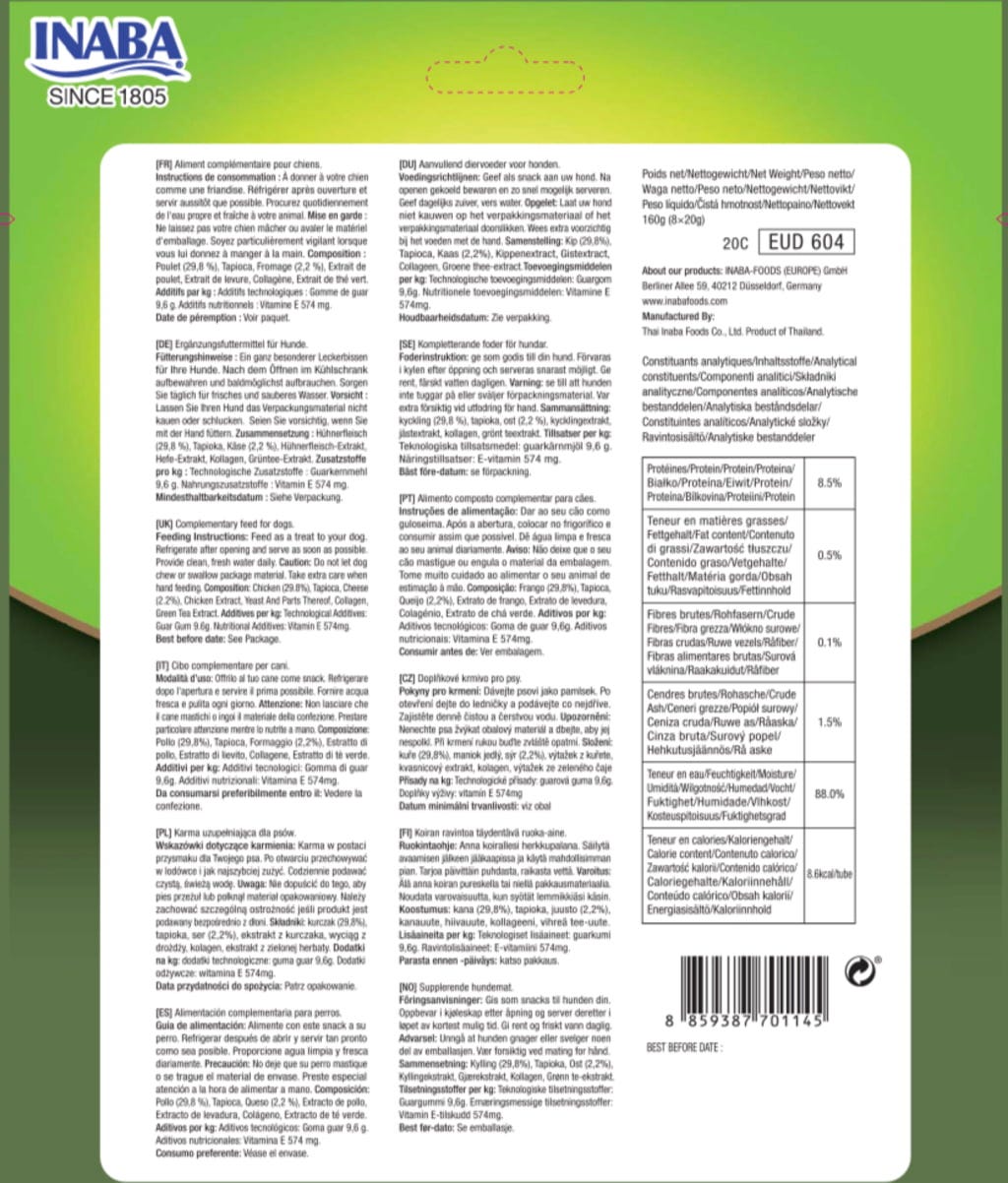 29,8 % poulet, tapioca, 2,2 % fromage, extrait de viande de poulet, levure, collagène, extrait de thé vert, gomme de guar