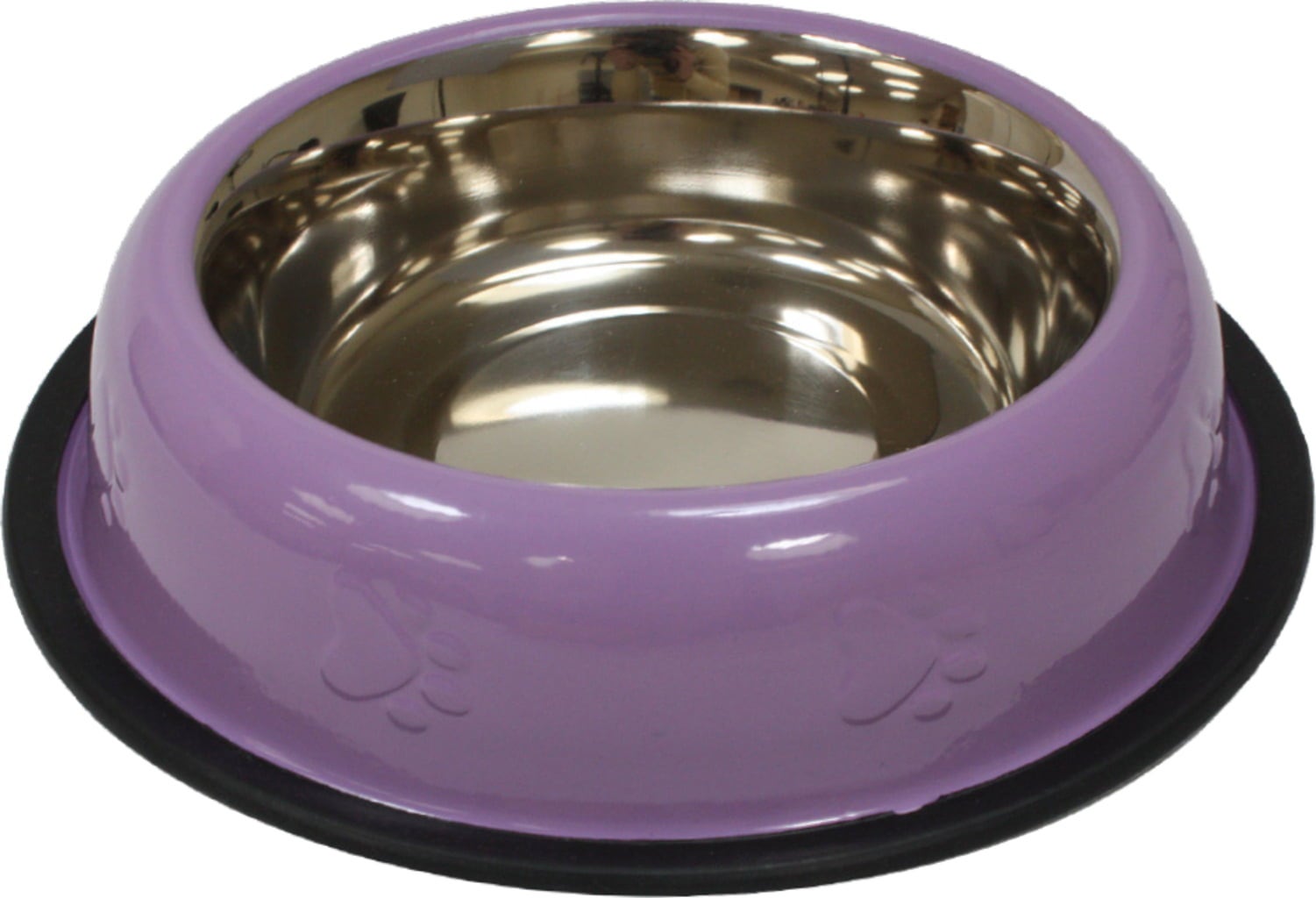 Gamelle en acier inoxydable décorée de petites pattes légèrement gravées. L'intérieur de la gamelle colorée est constitué d'une surface lisse qui se lave facilement, et aucun résidu de nourriture n'y reste collé.