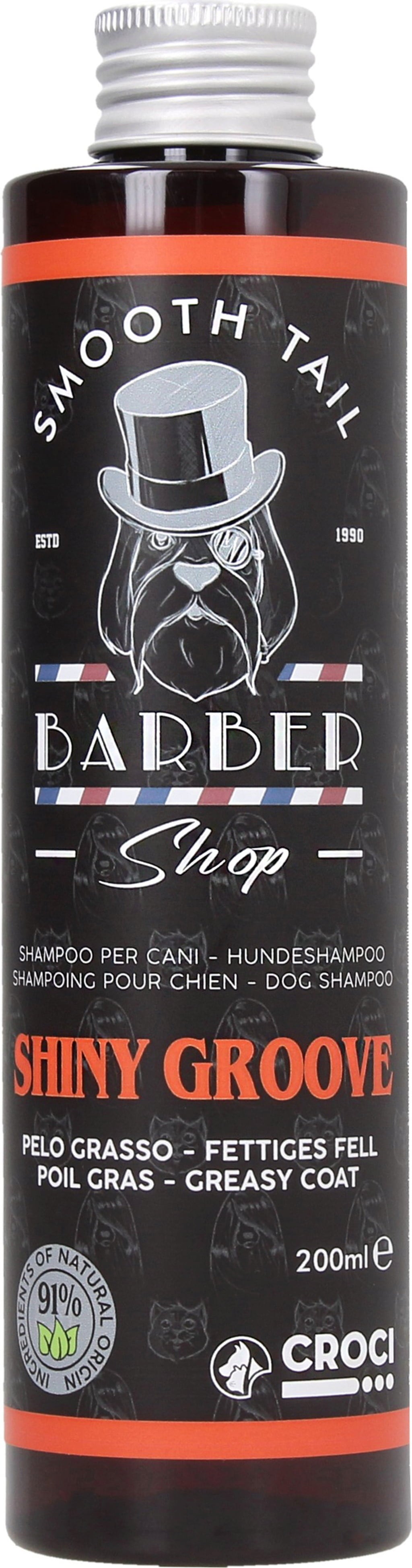 "Shiny Groove" fait partie de la ligne de soins Smooth Tail au parfum discret d'argan. Les produits ont un effet neutralisant sur les odeurs. Tous les produits Barbershop pour le toilettage des chiens contiennent des ingrédients naturels, sans parabènes ni colorants artificiels. Tous les tensioactifs sont à base d'origine végétale.