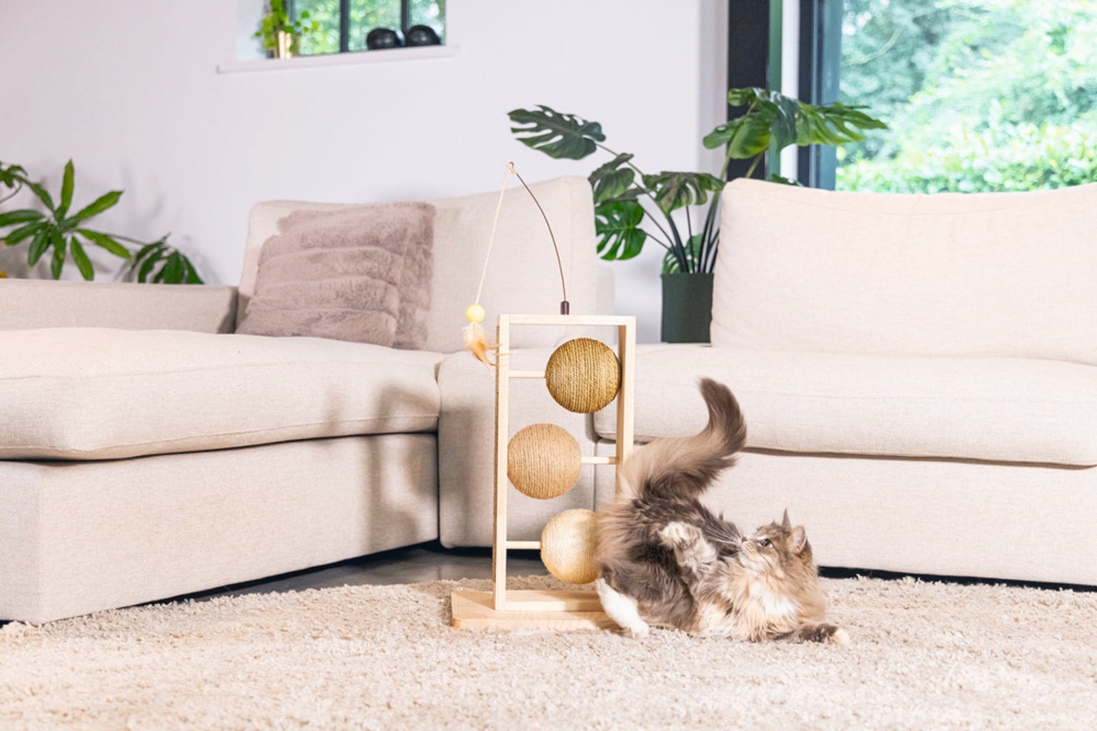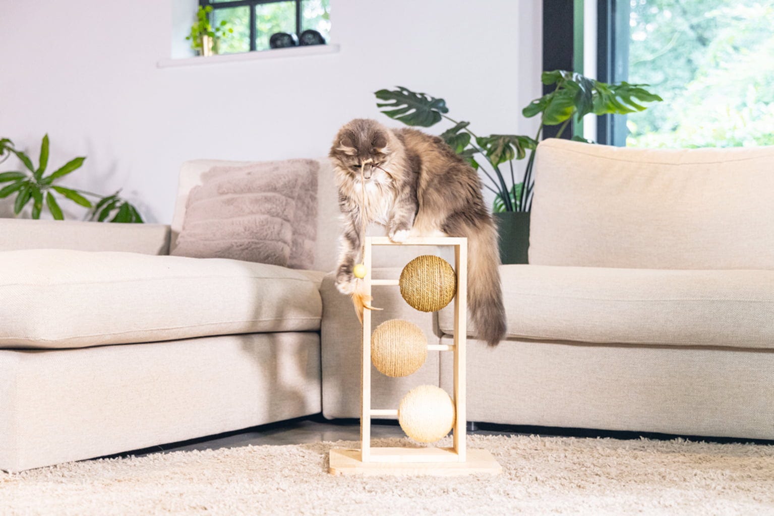 Trois sphères mobiles recouvertes de matériaux différents garantissent non seulement un grand plaisir pour faire ses griffes, mais aussi de longues heures de jeu. Les meubles deviennent soudainement bien moins attrayants et votre chat ne risque plus de s’ennuyer.