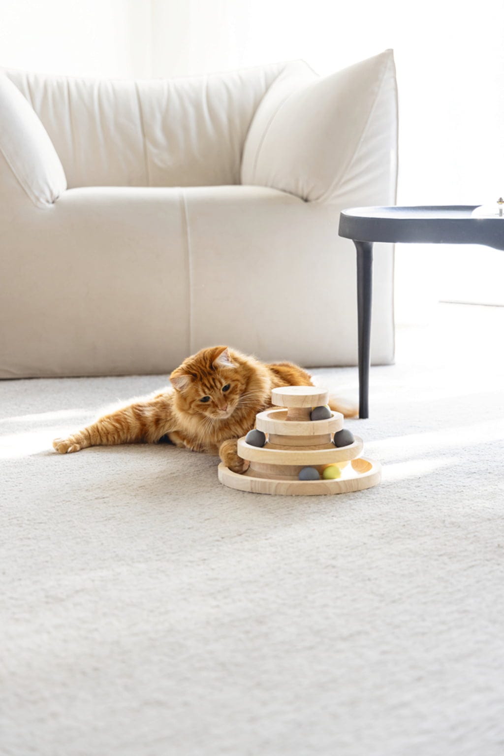 Cette tour est un véritable plaisir ! Réparties sur trois niveaux, six balles en bois stimulent l’instinct de jeu et de chasse, tout en chassant l’ennui en un instant.
