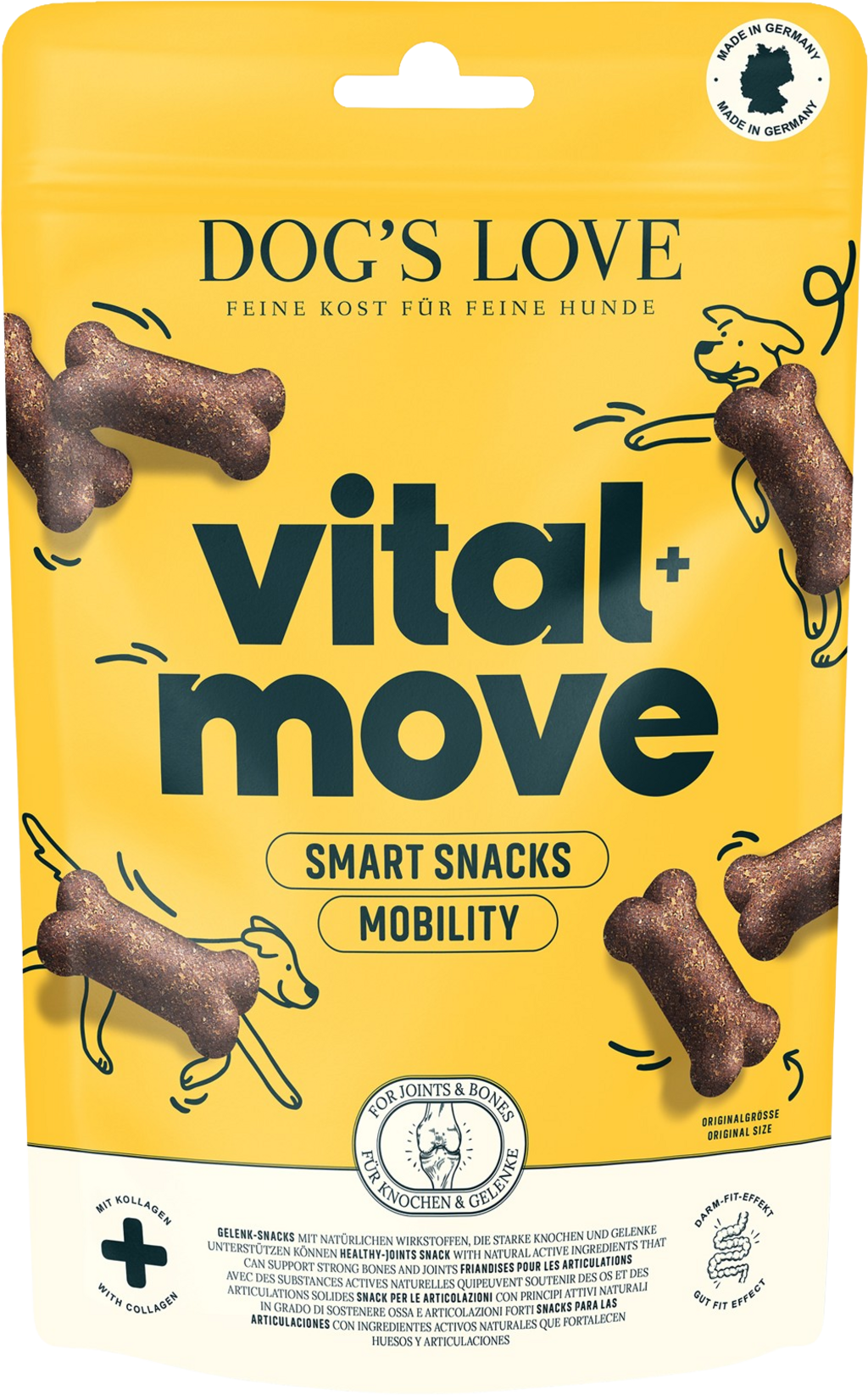 Avec les DOG'S LOVE Vital + Move Smart Snacks, vous pouvez soutenir la santé des os et des articulations de votre chien. Ces snacks contiennent une recette riche en collagène, MSM, chondroïtine, glucosamine, acide hyaluronique, griffe du diable et curcuma. Ils conviennent aux chiens de toutes tailles à partir de 6 mois.