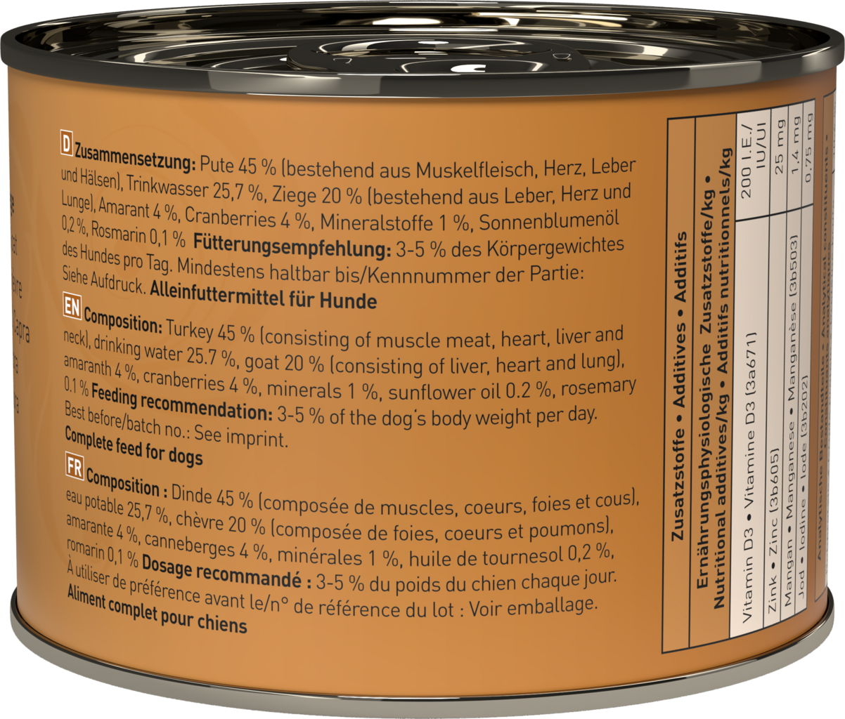 45 % dinde (muscle, cœur, foie, cou), 25,7 % eau , 20 % Ziege (foie, cœur, poumons), 4 % amarante, 4 % canneberges, 1 % Mineralstoffe, 0,2 % huile de tournesol, 0,1 % Rosmarin