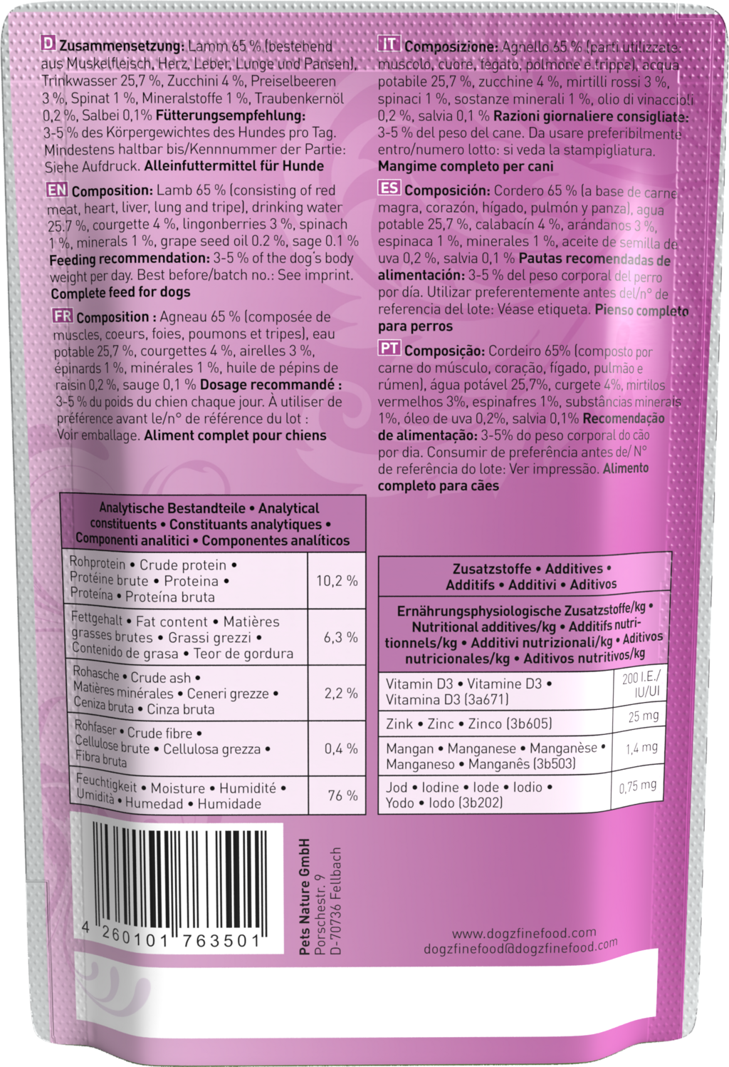 65 % agneau (muscle, cœur, foie, poumons, panse), 25,7 % eau , 4 % courgette, 3 % canneberges, 1 % épinards, 1 % Mineralstoffe, 0,2 % huile de pépins de raisins, 0,1 % sauge