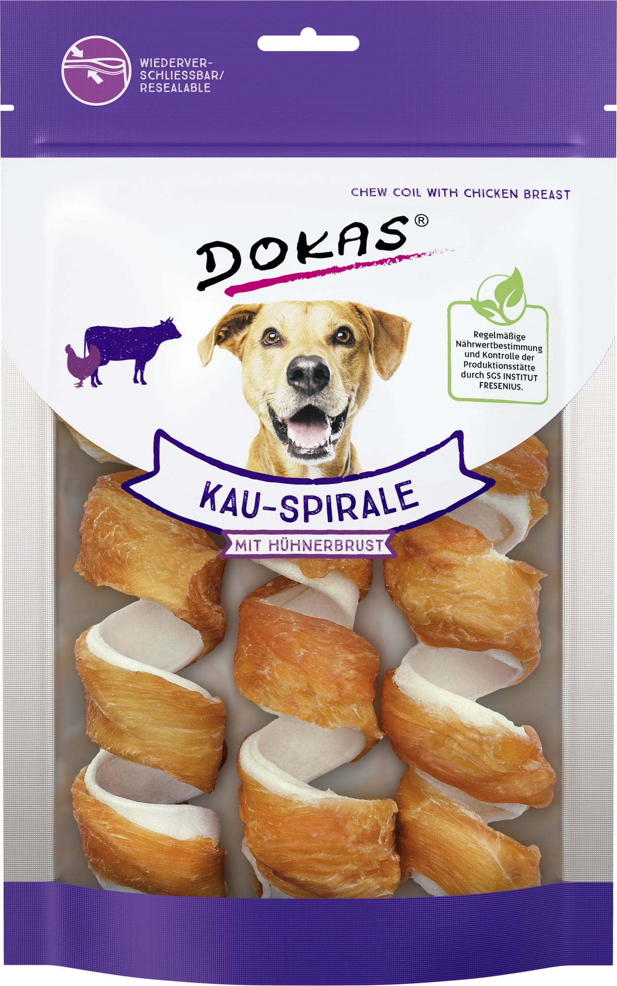 La spirale à mâcher au blanc de poulet de Dokas procure un plaisir de mastication irrésistible, que ce soit comme récompense ou comme snack. La mastication intensive contribue également à renforcer la musculature et peut favoriser l’hygiène dentaire quotidienne.