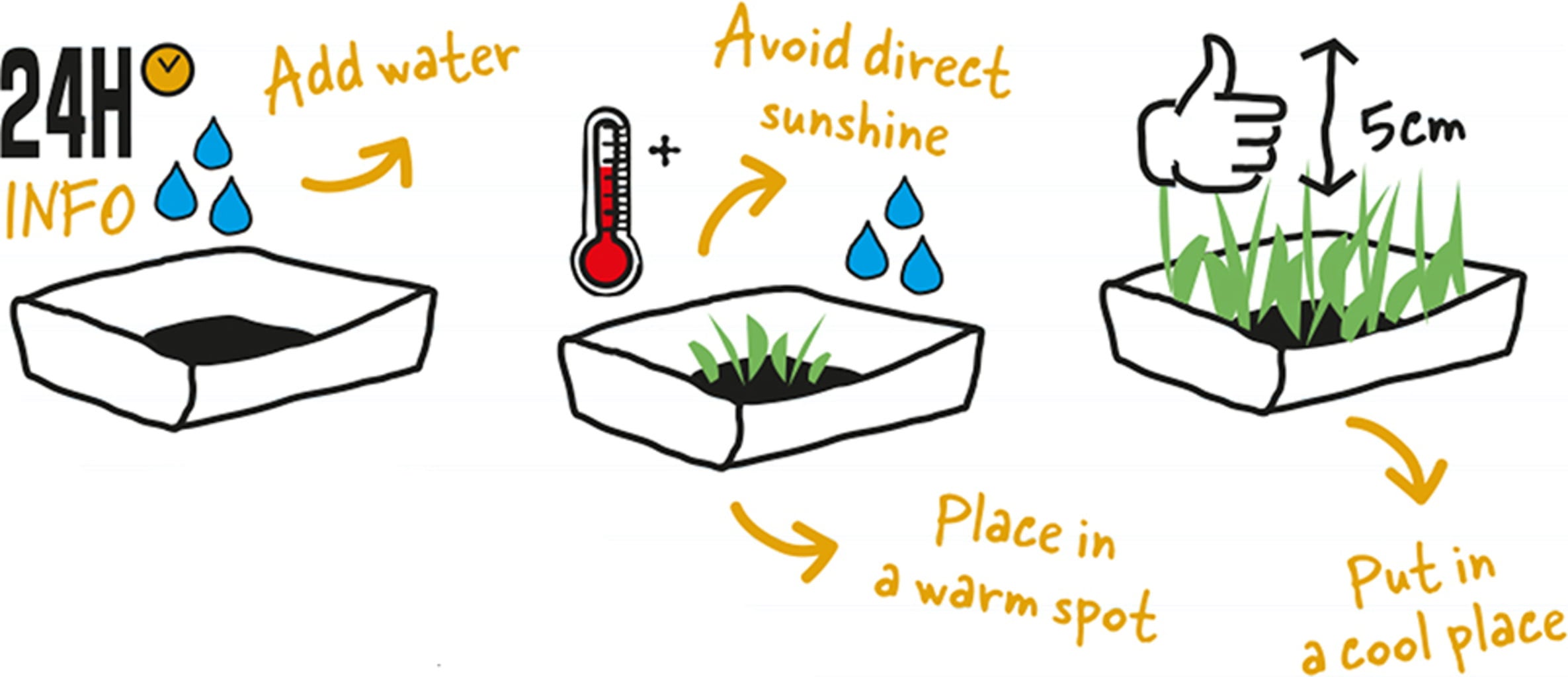 Enlever le couvercle et humidifier le lit de semences avec de l'eau. Attention à ne pas noyer les graines : si vous les immergez, débarrassez-vous du trop-plein. Humidifiez le lit de semences chaque jour, par exemple à l'aide d'un vaporisateur pour plantes. Lorsque l'herbe atteint environ 5 cm de hauteur, elle est prête à la consommation pour votre lapin ou votre rongeur. Placez le kit dans un endroit frais pour que l'herbe reste fraîche plus longtemps.