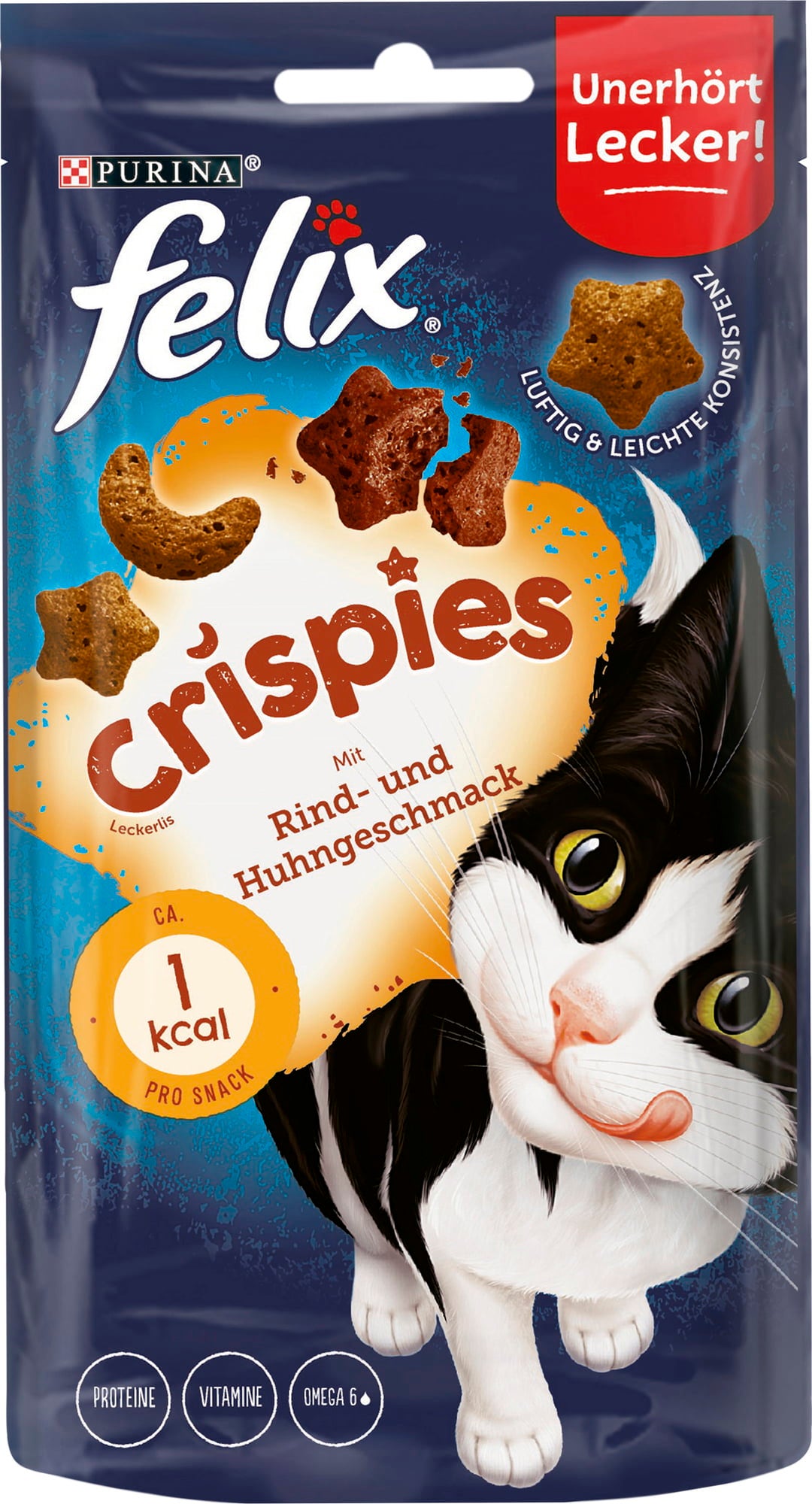 Croc, croc… un goût tout simplement irrésistible ! Les Felix Crispies offrent de véritables moments de plaisir et réveillent le petit lion qui sommeille en votre gourmet ! Leur texture légère et croustillante séduit avec des saveurs de bœuf et de poulet, sans aucun ajout de colorants artificiels.