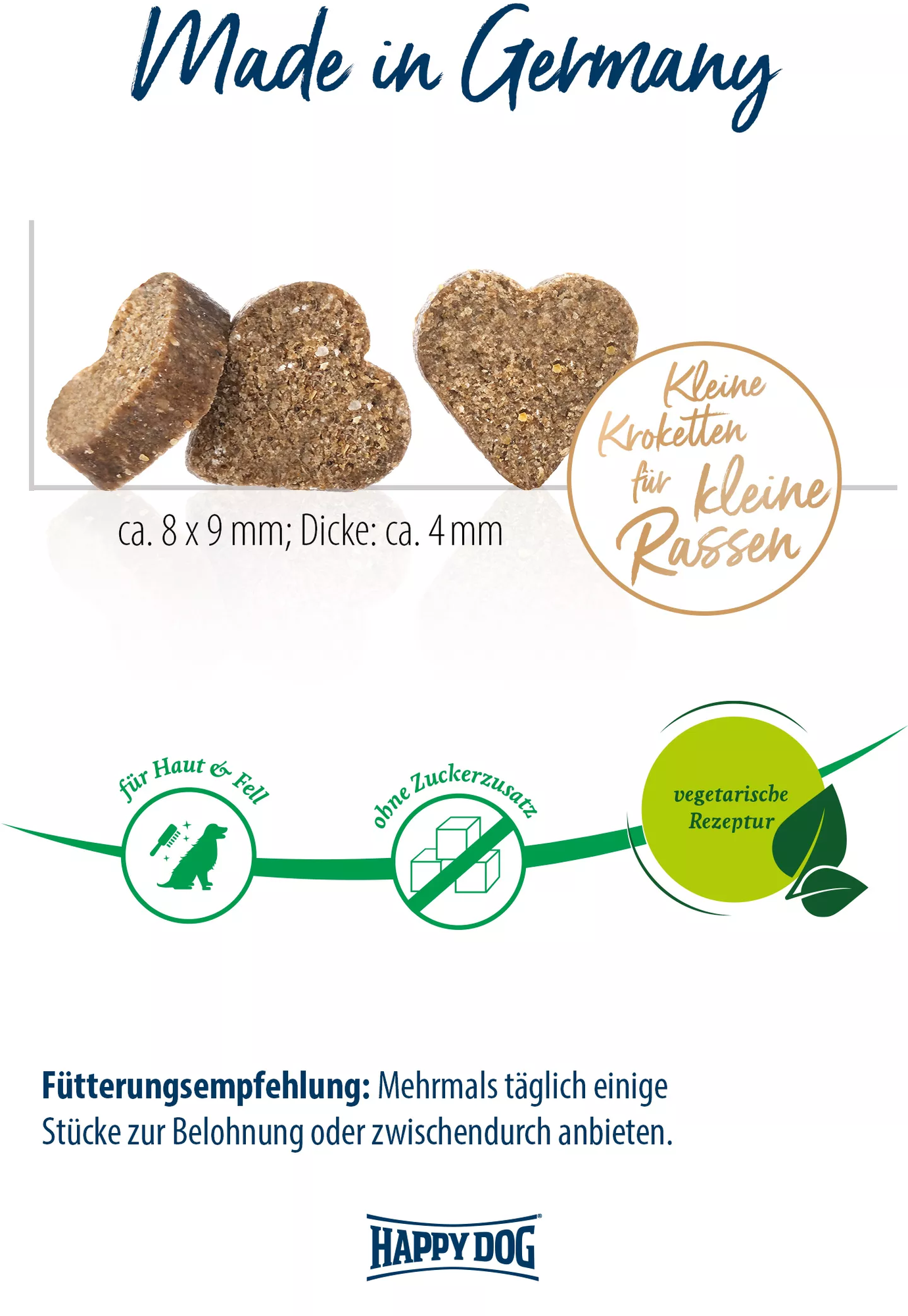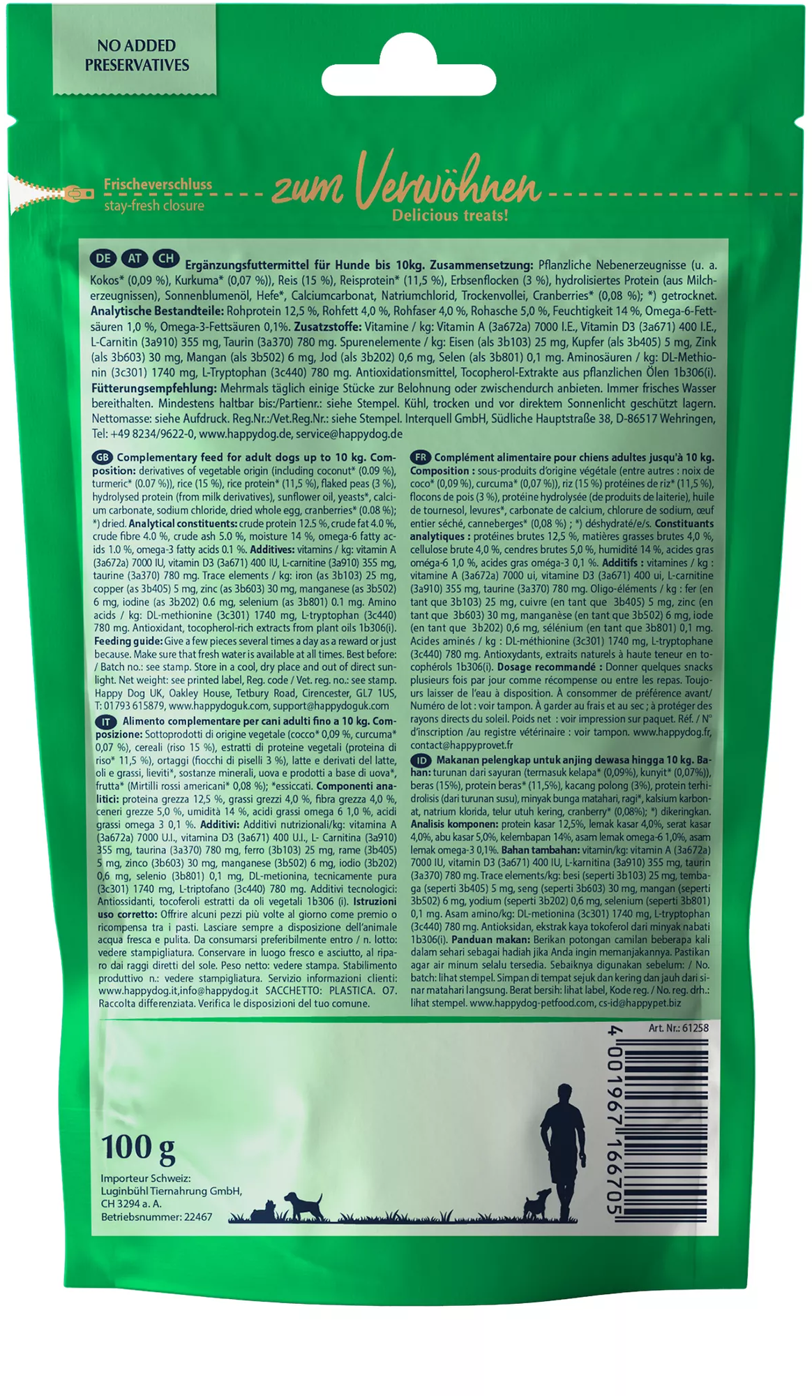 Élaborés sans sucres ajoutés ni conservateurs, ces snacks sont conditionnés dans un sachet refermable pratique garantissant une fraîcheur durable. Fabriqué en Allemagne. Convient aux chiens adultes jusqu’à 10 kg.