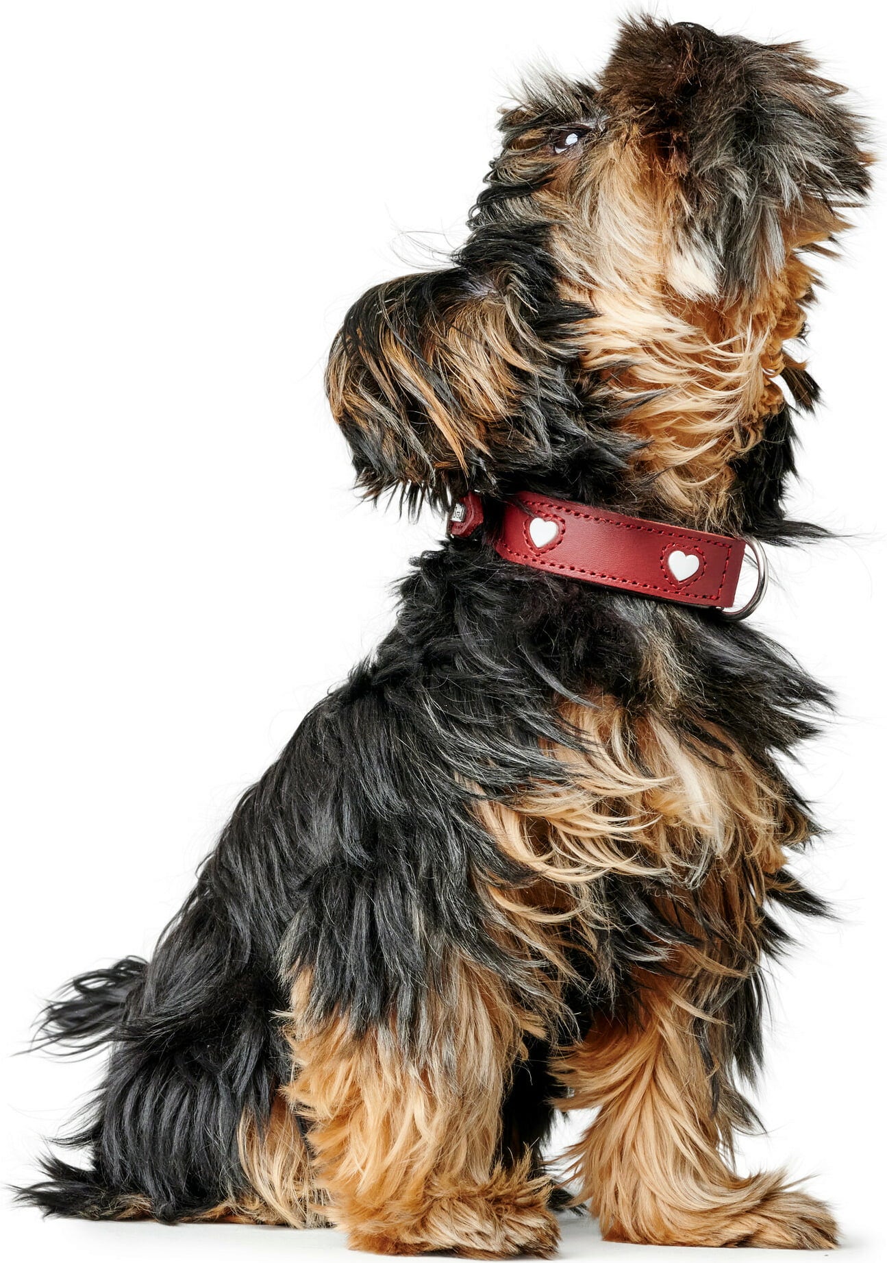 Le collier "Love" tendance de HUNTER réunit une passion pour la perfection artisanale, des matériaux de grande qualité et un design unique : le dessus et le dessous sont en cuir de vache, doublé d'un cuir nappa de vache particulièrement doux. Les cœurs sont fabriqués à la main par une manufacture de Bielefeld et sont bordés et cousus individuellement.