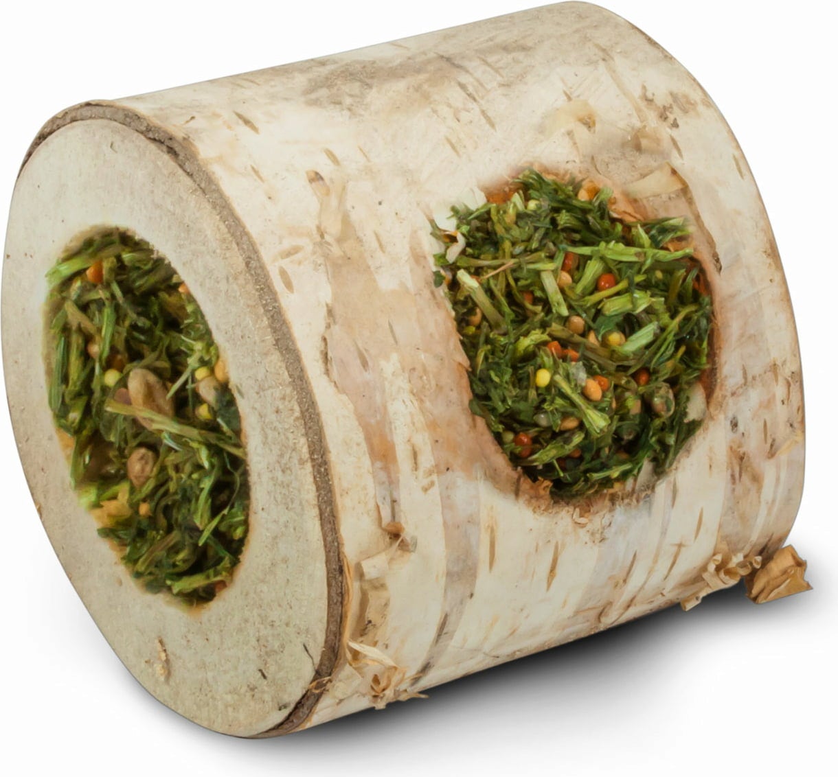 Morceau de bois de feuillu creuser avec, à l'intérieur, une délicieuse garniture à base de millet, de blé et de persil aromatique à aller chercher. De quoi les occuper un temps !