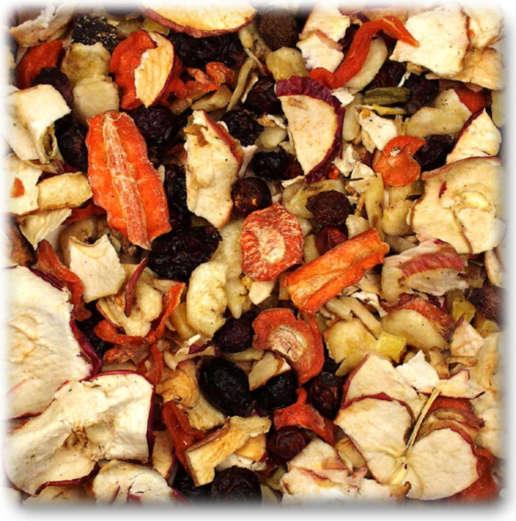 cynorrhodon, 31 % Banane, carotte séchée, 15 % pomme , Pommes de terre, panais, baies de sorbier, Poireau