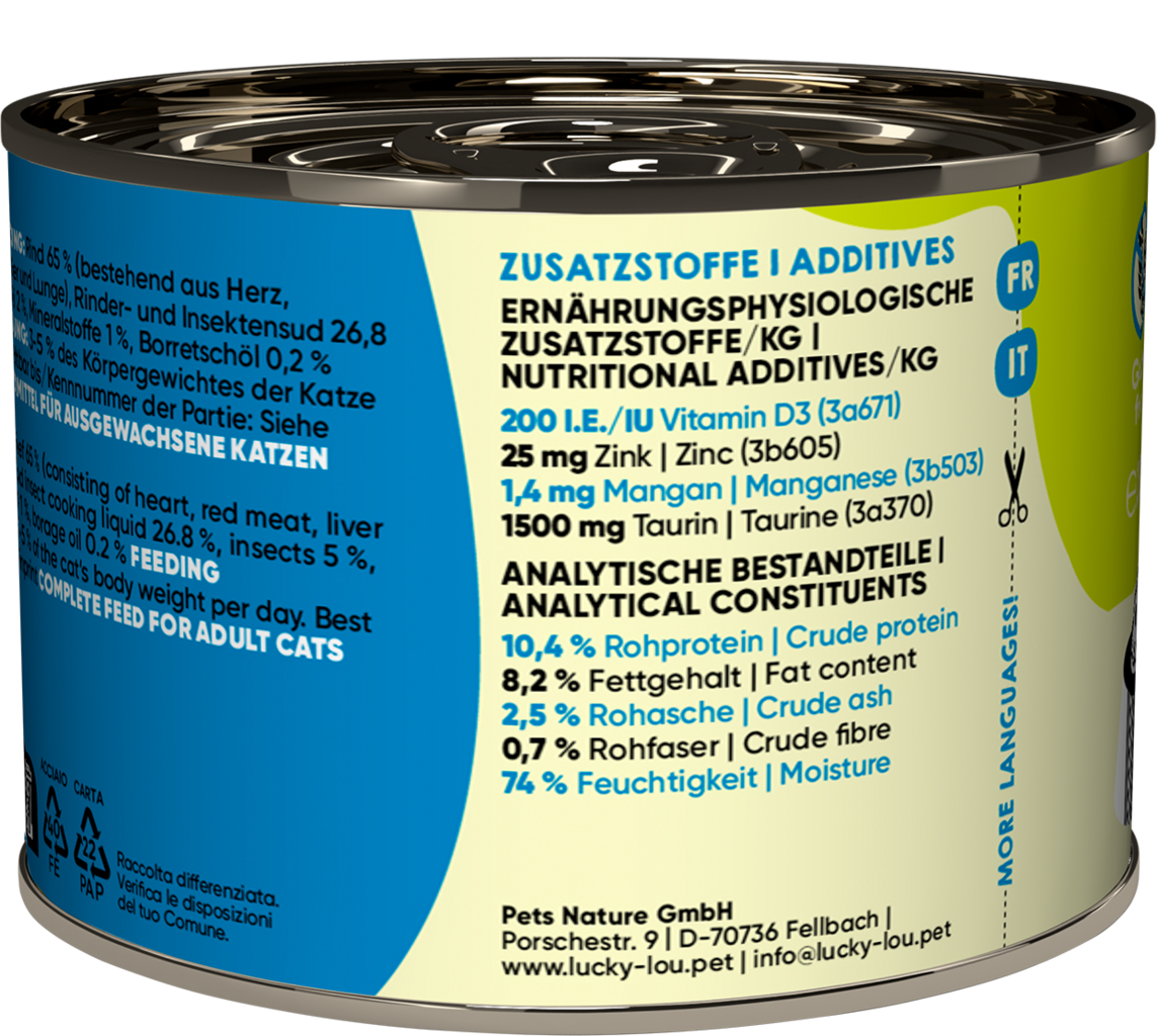 65 % boeuf (cœur, muscle, foie, poumons), 26,8 % Rinder- und Insektensud, 5 % insectes, 2 % courgette, 1 % Mineralstoffe, 0,2 % Borretschöl