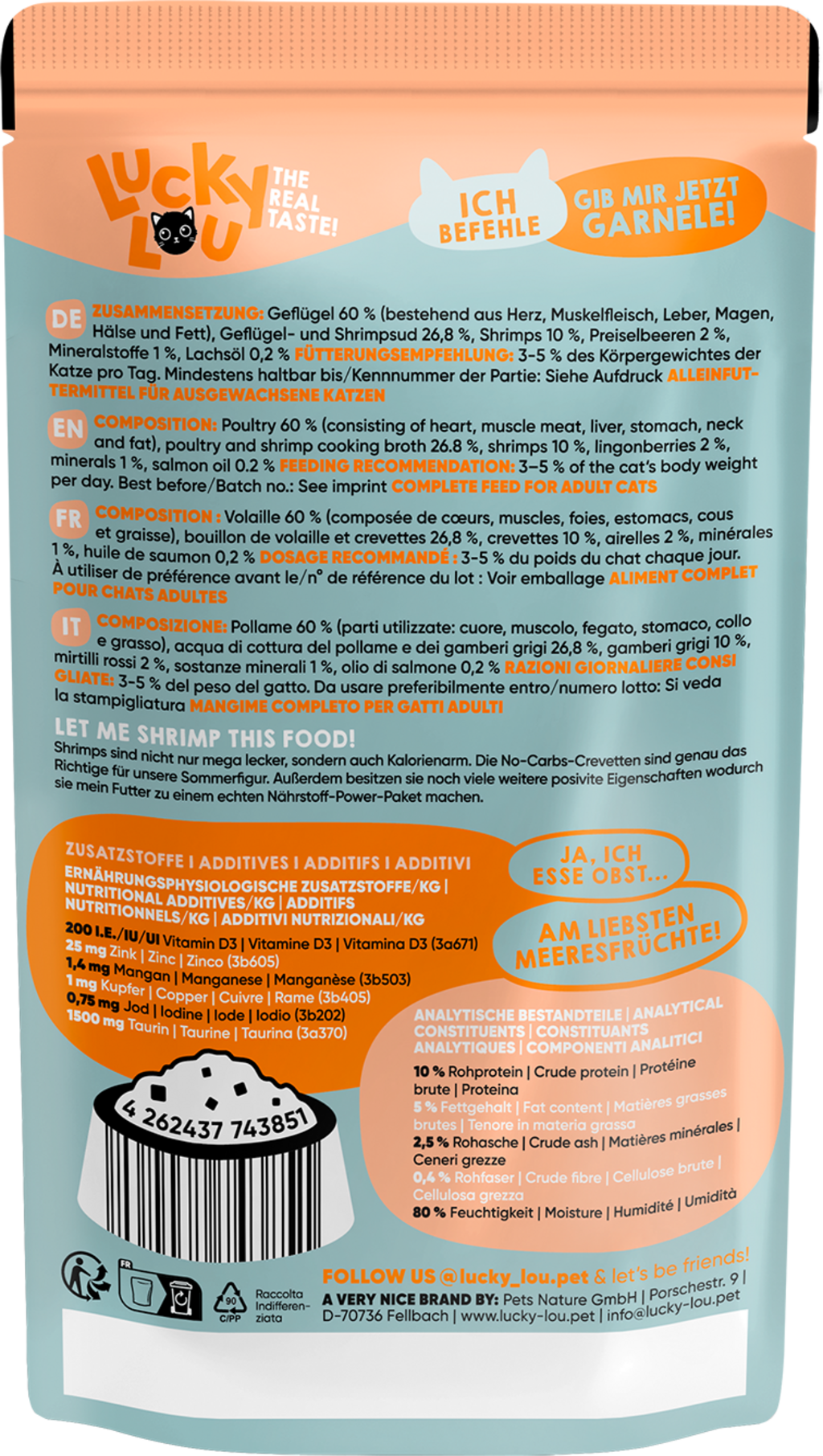 avis en français à propos du produit Lucky Lou Alimentation Humide Lifestage Pouch Adulte Volaille & Crevettes