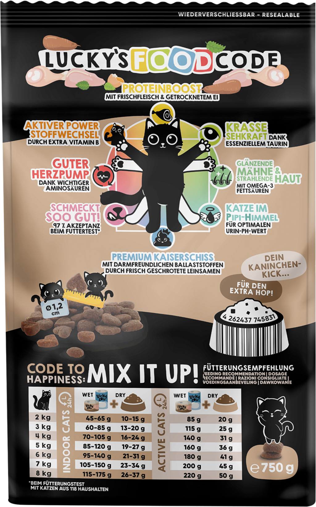 Lucky Lou Food Code est un aliment sec de qualité supérieure, car il a non seulement un goût irrésistiblement croquant et délicieux, mais fournit également à votre chat des nutriments précieux adaptés à son âge. Inspirée des proportions parfaites de l'Homme de Vitruve de Léonard de Vinci, la recette équilibrée de ces croquettes offre 8 bénéfices par variété qui prennent soin de votre chat de la tête aux pieds.