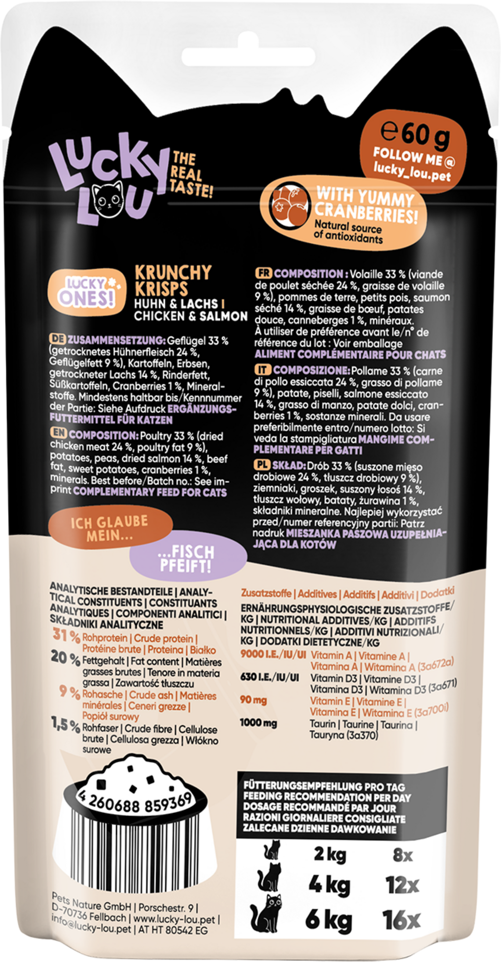 Irrésistiblement croquants à l'extérieur et merveilleusement moelleux à l'intérieur, les Krunchy Krisps emmènent votre félin au 7ème ciel des friandises. Et là, il ne l'attend pas seulement un goût divin, mais aussi une recette adaptée aux chats avec des ingrédients sélectionnés comme des huiles précieuses et des superaliments. Votre chat peut en profiter sans modération.