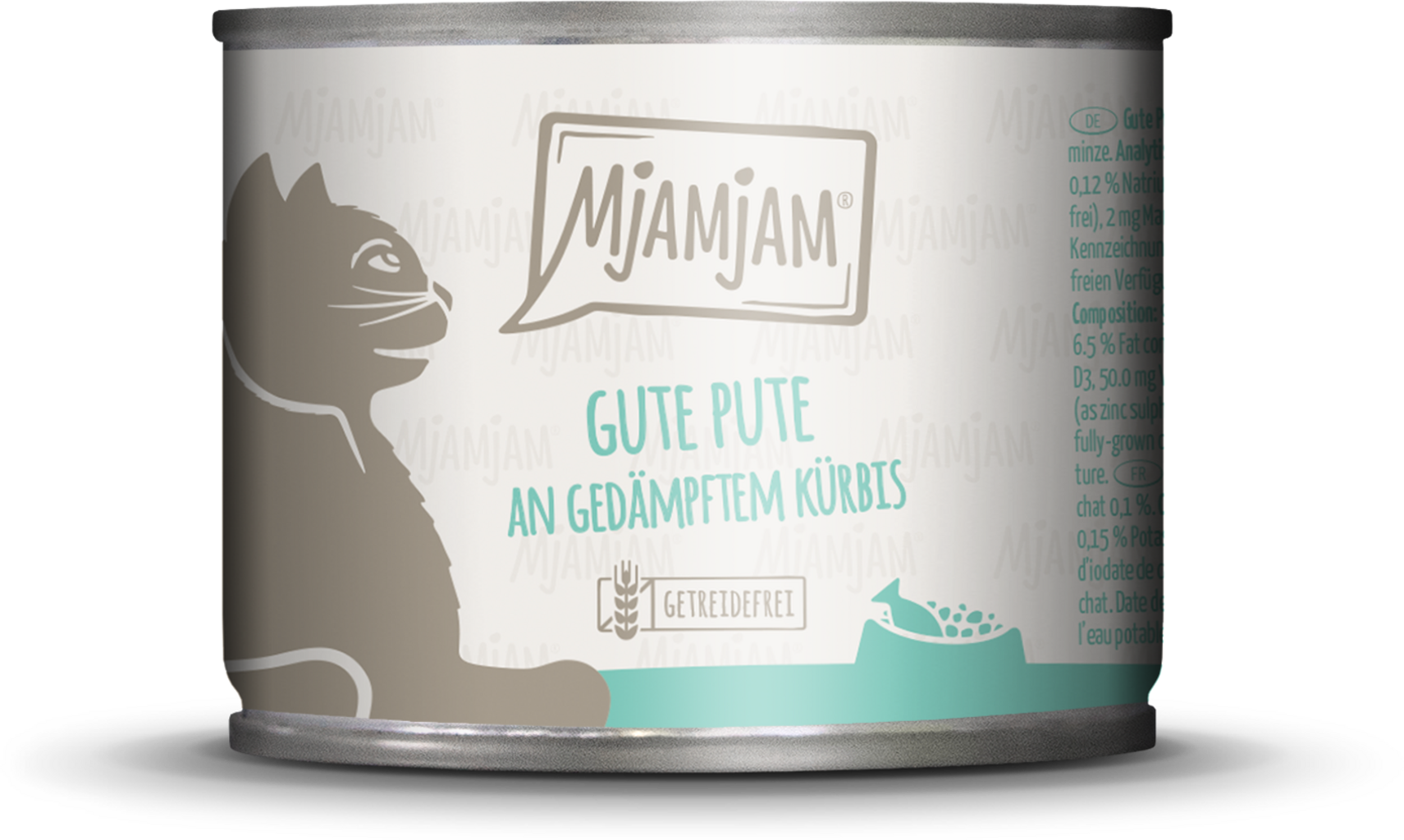 La nourriture humide de Mjamjam offre à votre chat une saveur riche, une qualité incomparable et une touche d’amour. Votre animal de compagnie profite d’un repas sain composé de dinde fraîche, de courge cuite à la vapeur et d’un peu d’herbe à chat.