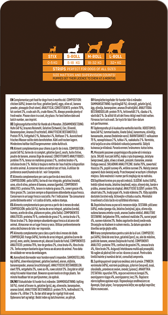Le snack à mâcher No-Hide™ au poulet est une alternative innovante et sûre aux masticatifs traditionnels en peau brute. Spécialement formulé pour offrir à votre chien une expérience de mastication savoureuse et durable, il évite le risque d’éclats souvent associé aux masticatifs classiques en peau brute.
