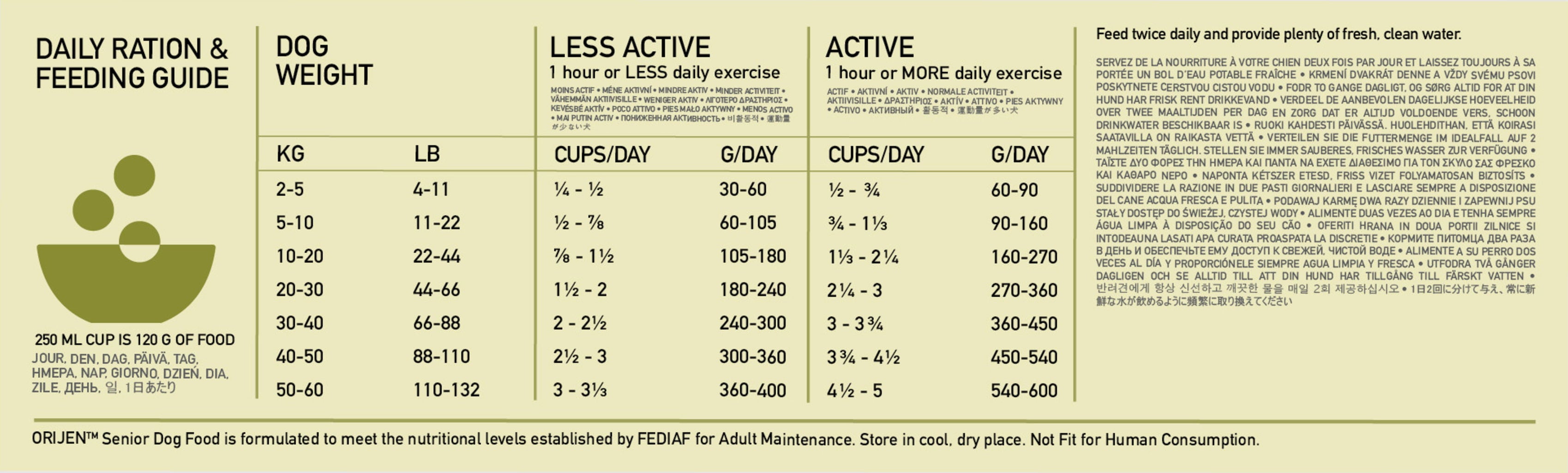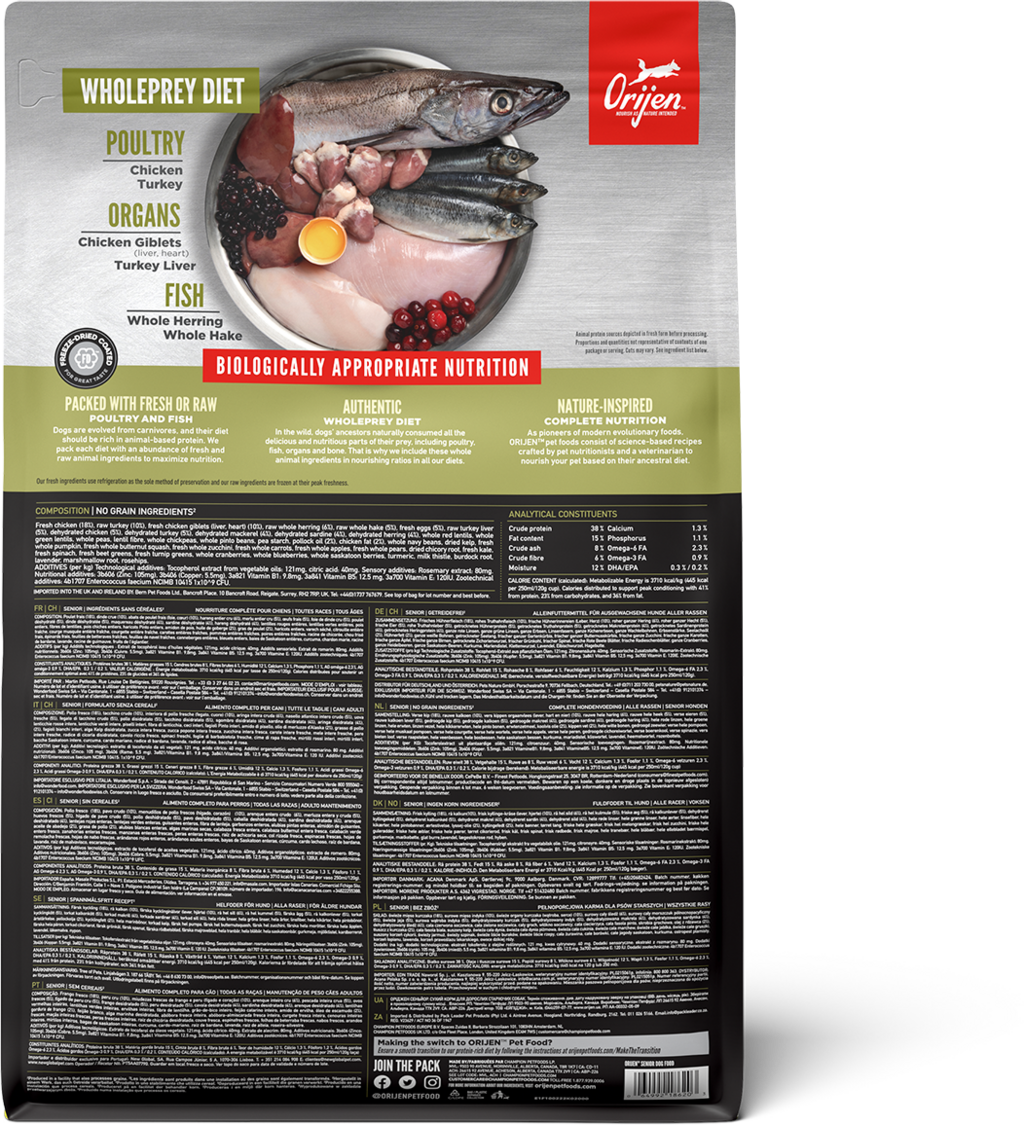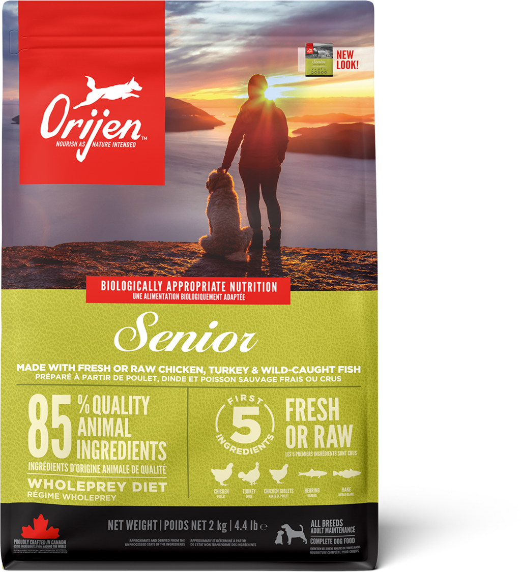 L’aliment pour chiens seniors d’Orijen est spécialement adapté aux chiens âgés. Il est élaboré à partir d’ingrédients frais et de haute qualité, avec des proportions de volaille et de poisson.