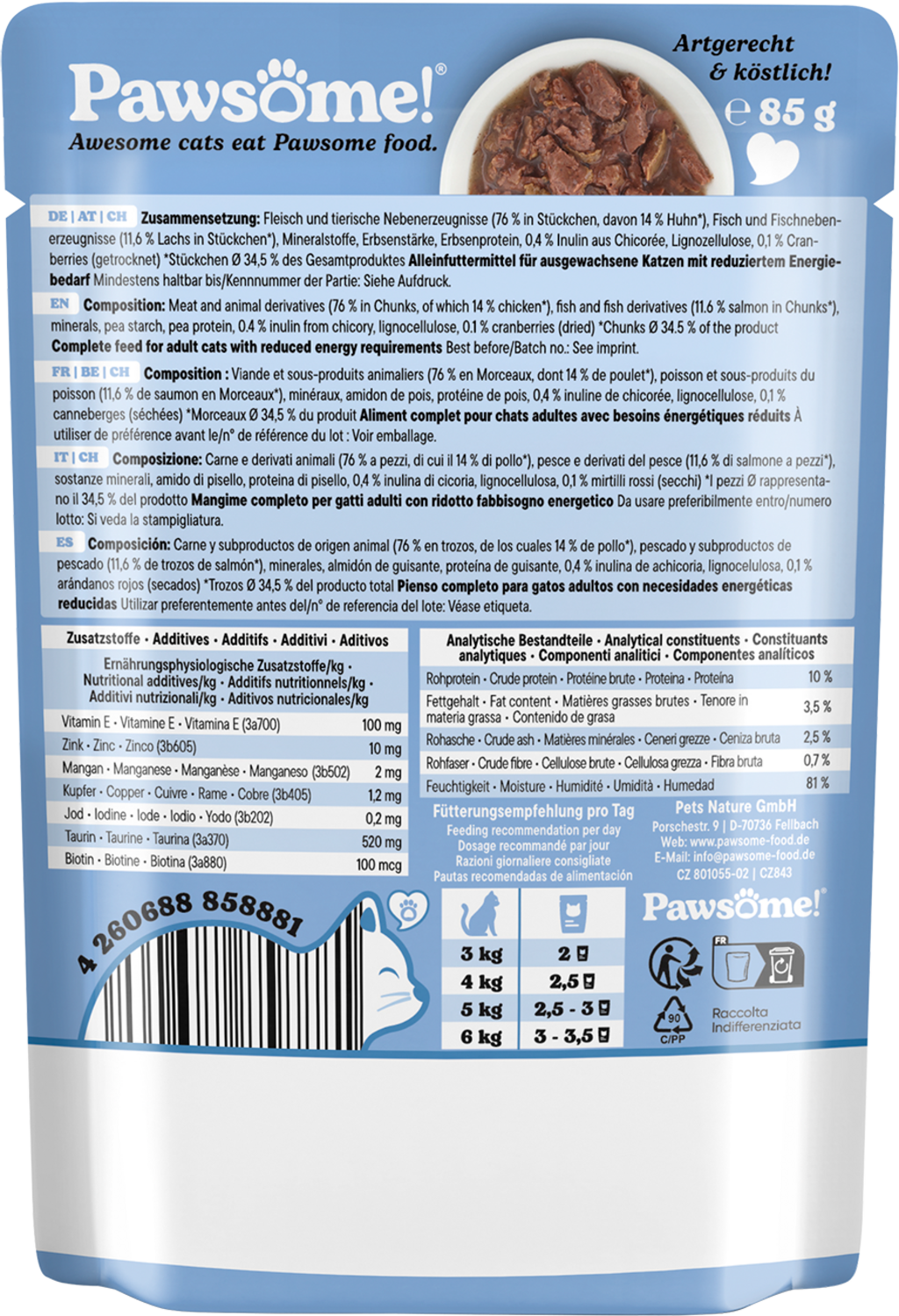 La pâtée Pawesome! avec de tendres morceaux de viande et une sauce savoureuse ravira même les chats les plus exigeants. Cet aliment complet délicieux est élaboré à partir d’ingrédients naturels soigneusement adaptés à chaque étape de la vie de l’animal. Des superaliments sélectionnés garantissent un apport optimal en vitamines et nutriments essentiels.