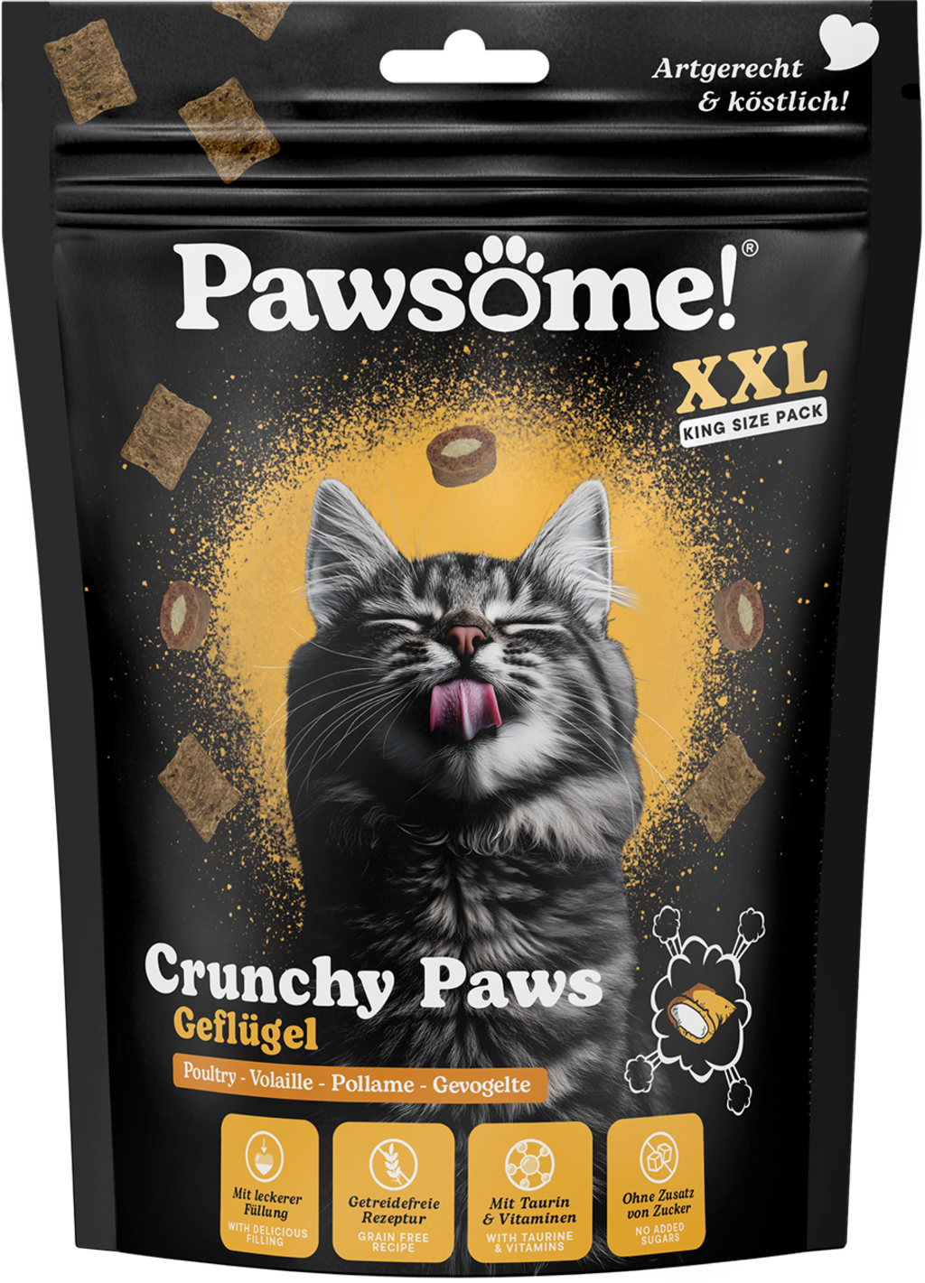 Avec les Paws de Pawsome!, chaque pause devient un véritable moment de gourmandise. Ces snacks croquants au cœur fondant sont entièrement sans céréales et sans sucre ajouté. La taurine, les vitamines, la levure de bière comme source naturelle de vitamines B et l’herbe à chat offrent à votre félin une pause aussi savoureuse que bénéfique.