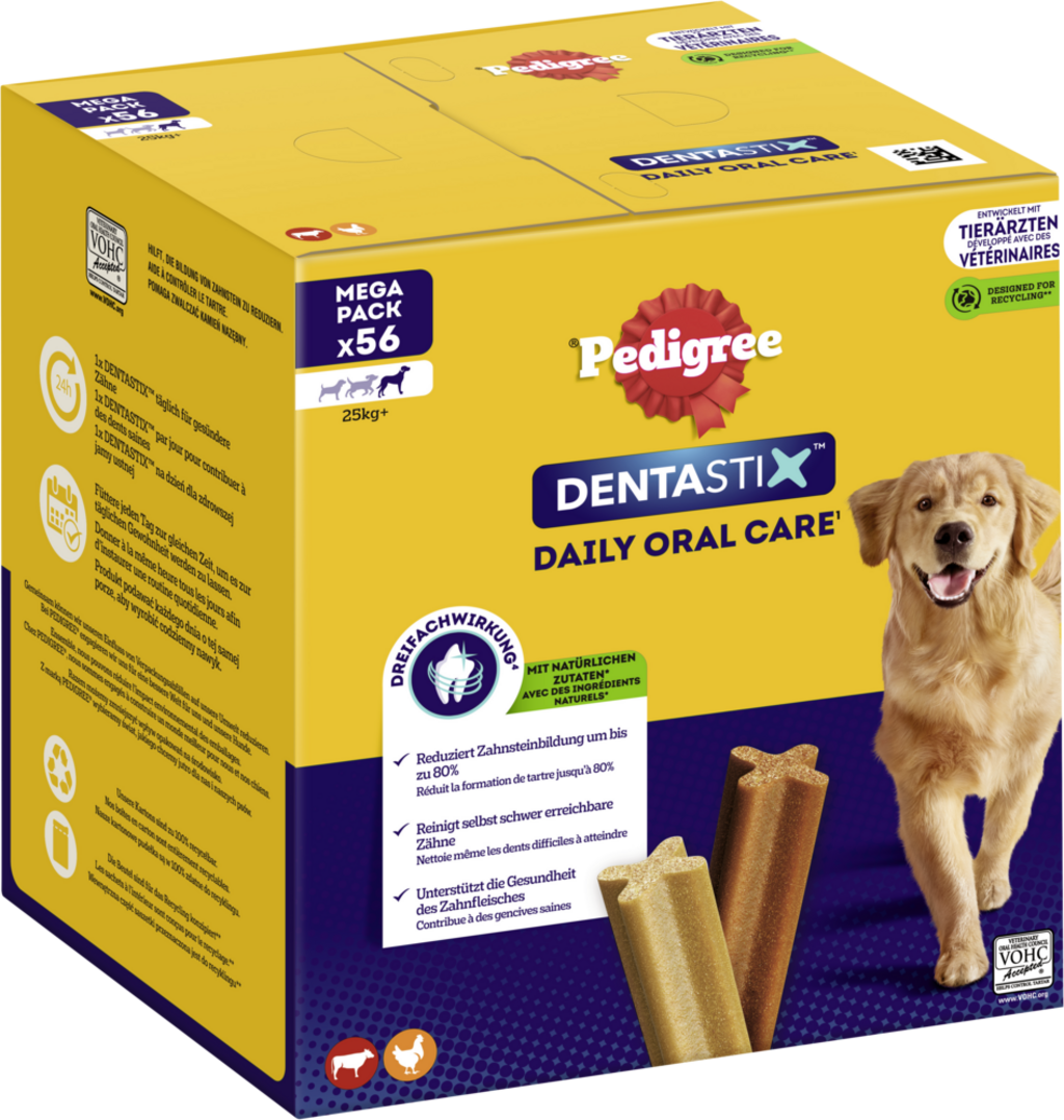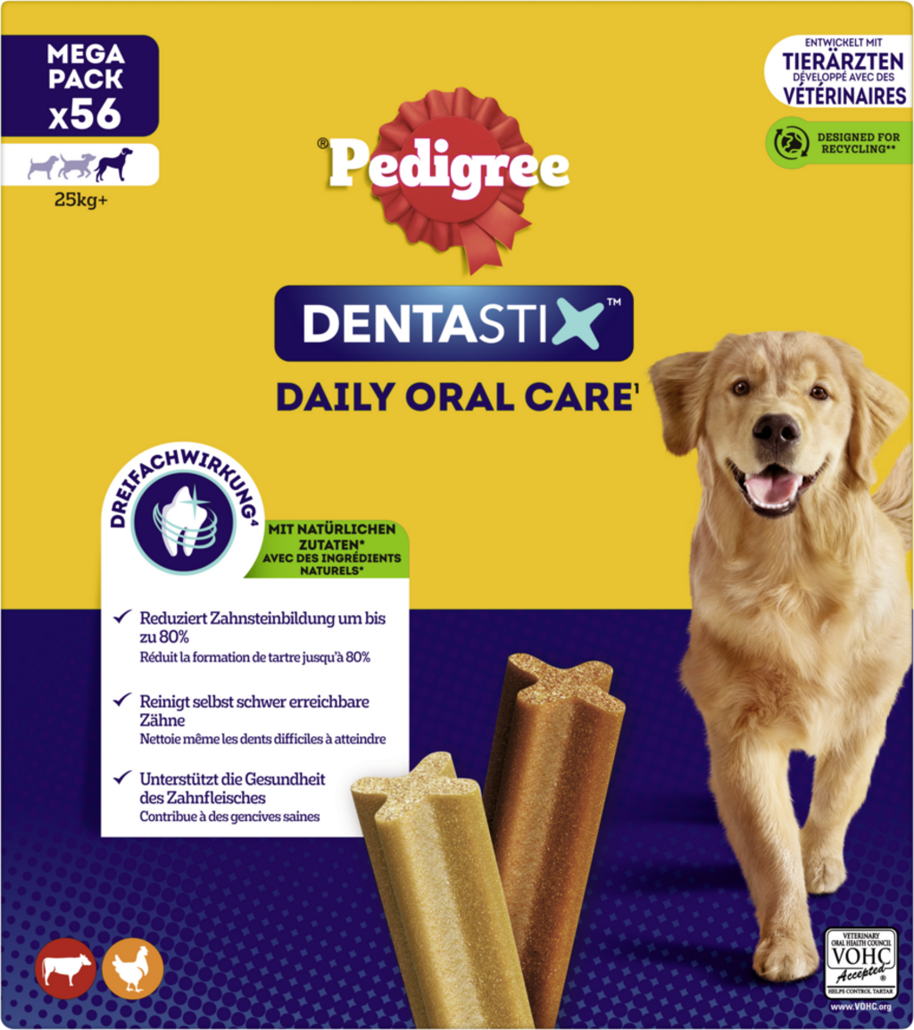 Rations recommandées du fabricant : les chiens de grande taille, comme les Labradors, peuvent recevoir jusqu’à 1 stick par jour. Dentastix Large ne convient pas aux chiens de moins de 4 mois ni à ceux pesant moins de 25 kg. La quantité d’aliment principal doit être réduite en conséquence.