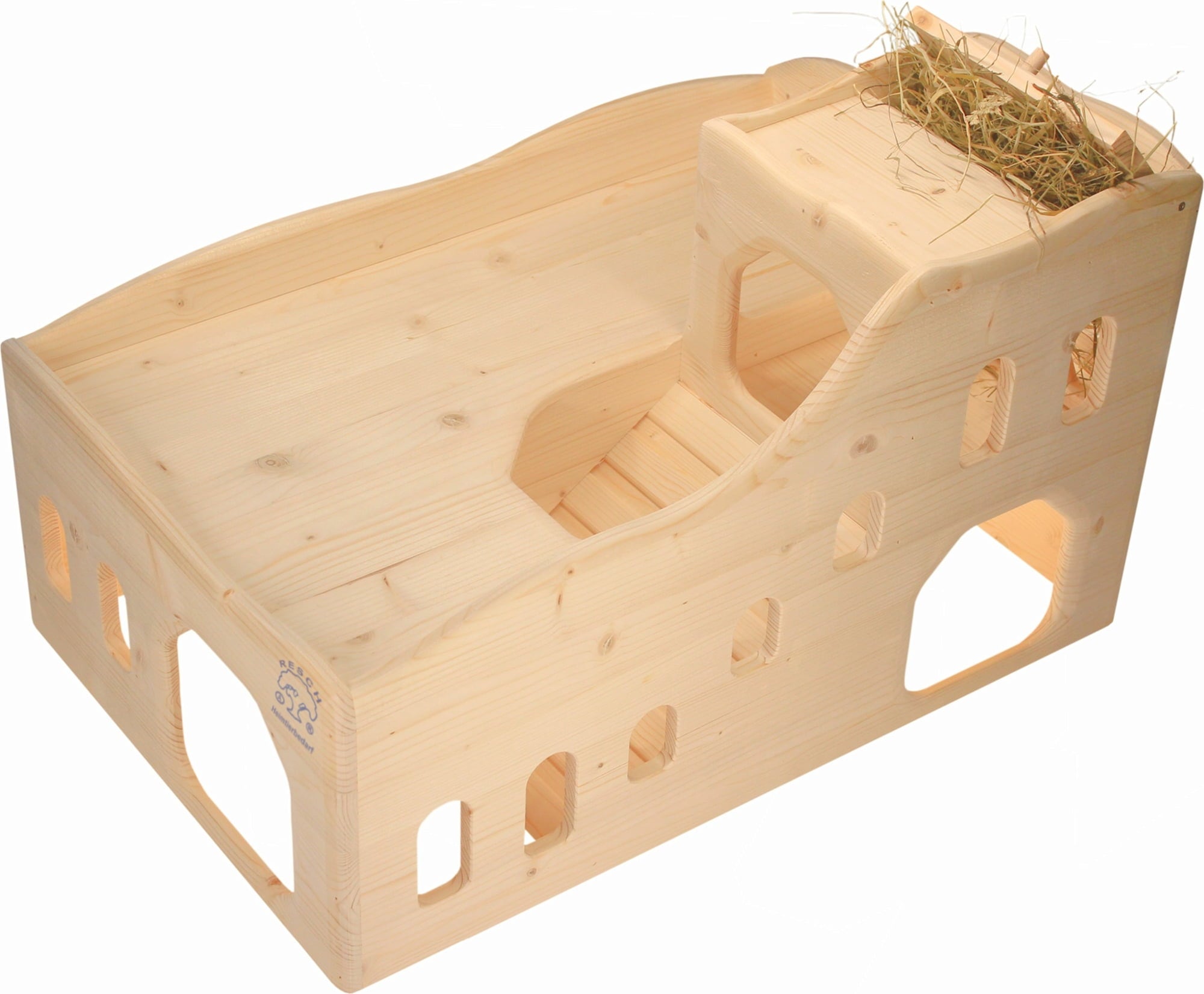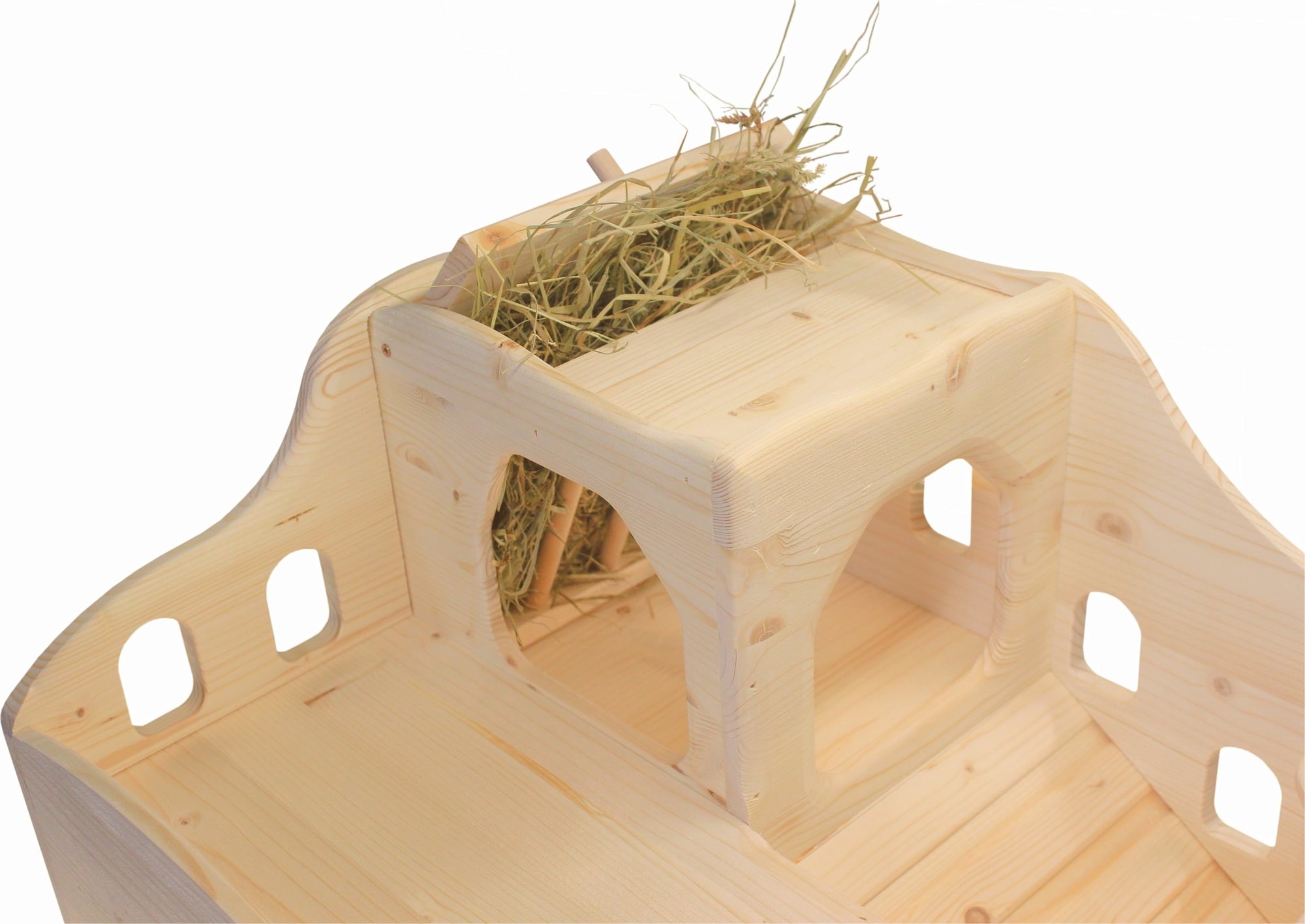 Le château possède un étage inférieur avec beaucoup d'espace pour se retirer. Un tunnel relie les deux entrées principales et un escalier mène à l'étage supérieur. Là, votre animal de compagnie trouvera une terrasse spacieuse et une petite tour avec un râtelier à foin et son couvercle. Tu peux aménager la terrasse en espace pour l'alimentation, ou bien l'équiper de jouets adaptés.