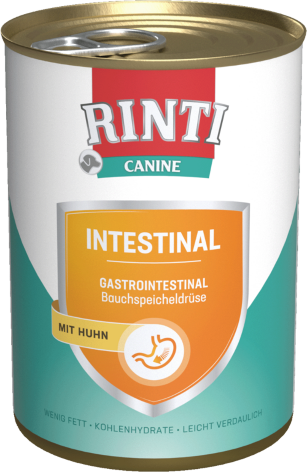Canine Intestinal de Rinti est spécialement conçu pour les chiens souffrant de maladies gastro-intestinales du pancréas, de l'estomac ou des intestins. Il s'agit d'un aliment humide diététique très digeste, pauvre en matières grasses et riche en électrolytes (sodium, magnésium, calcium, potassium), qui contribue à compenser les troubles digestifs et les insuffisances pancréatiques exocrines ainsi qu'à soulager les troubles de l'absorption intestinale.
