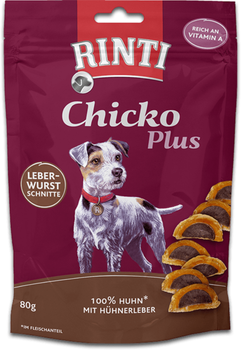 Rinti Chicko Plus Foie de Poulet - 80 g, Tranches de saucisse au foie (80 g)
