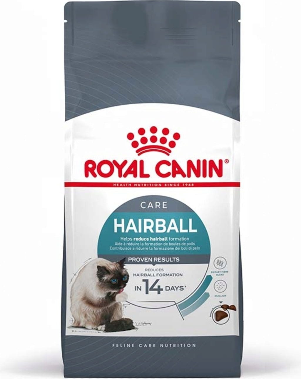 Grâce à un mélange spécifique de fibres naturelles, dont le psyllium, ROYAL CANIN® Hairball Care stimule naturellement le transit intestinal. Les poils ingérés sont ainsi plus facilement éliminés dans les selles plutôt que par vomissement. Cette recette contient également une teneur équilibrée en minéraux afin de soutenir la santé des voies urinaires du chat adulte.