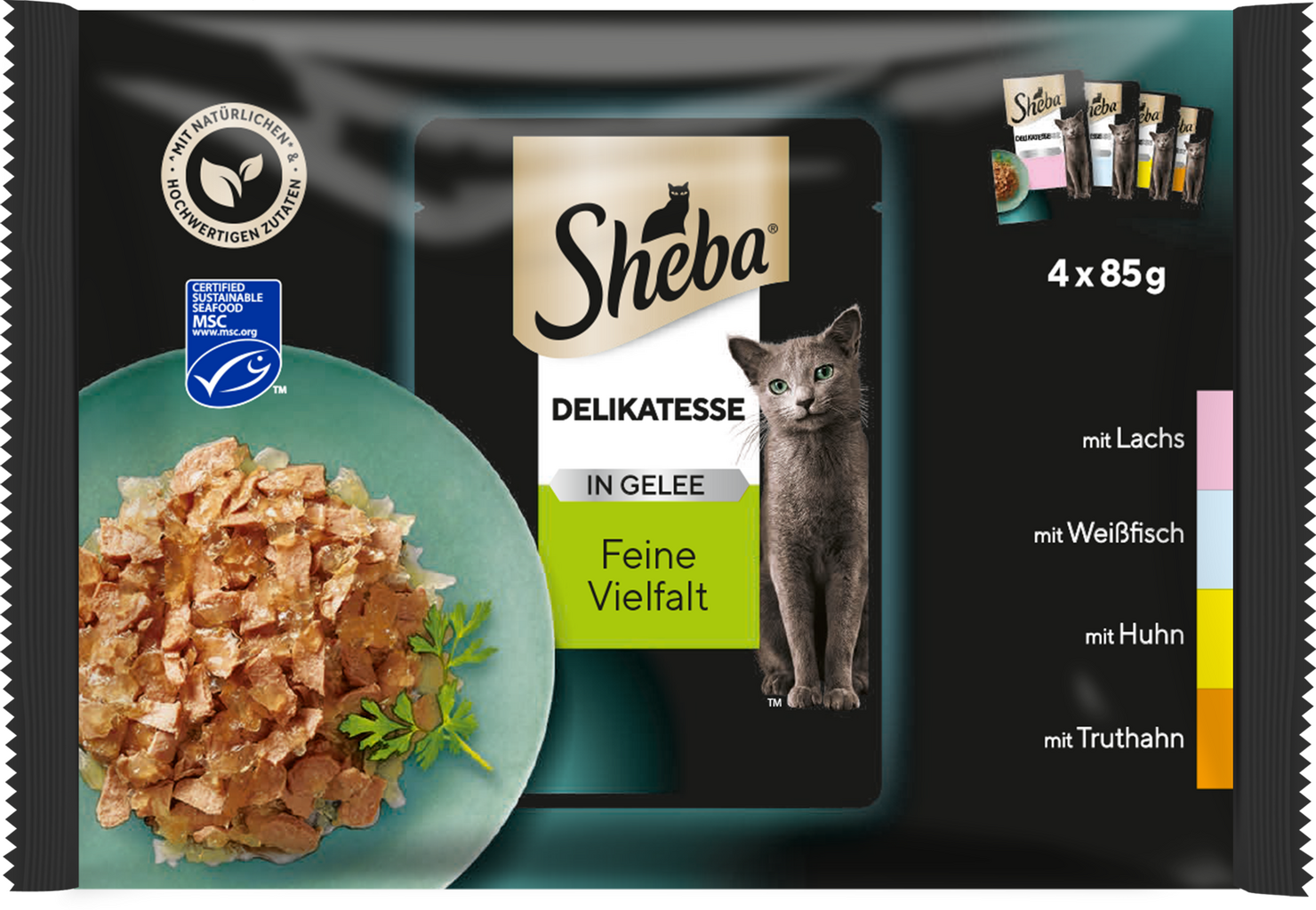 avis en français à propos du produit Sheba Sachets Fraîcheurs Délicatesses Gelée Sélection Terre & Mer - 4 x 85 g