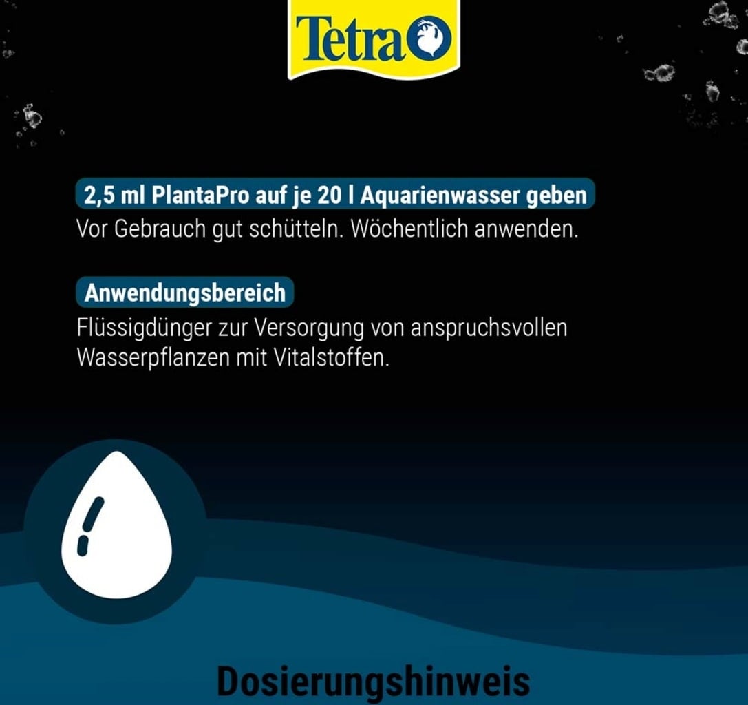 Tetra PlantaPro ajoute des oligo-éléments et des vitamines qui sont utilisés rapidement et de manière ciblée, assurant ainsi une croissance saine et luxuriante des plantes avec des feuilles bien vertes et des couleurs vives. Cela empêche également les carences en substances vitales. Une croissance vigoureuse des plantes est le meilleur moyen de lutter contre les algues. Tetra PlantaPro permet l'absorption des nutriments par les feuilles et ne pollue pas l'eau car le produit est exempt de phosphate et de nitrate.
