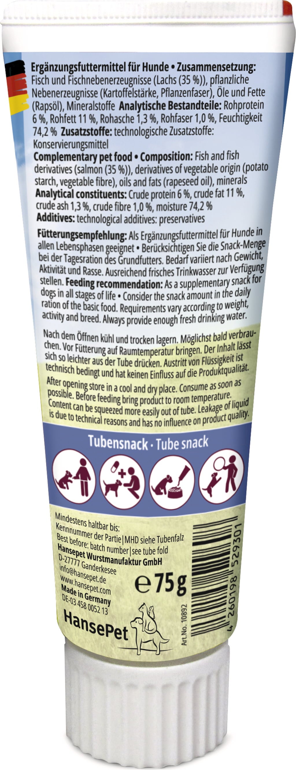 Pour ce pâté de poisson raffiné, du saumon frais est utilisé. Les colorants, exhausteurs de goût et autres additifs sont volontairement exclus. De plus, ce pâté est particulièrement pratique à donner directement depuis le tube.