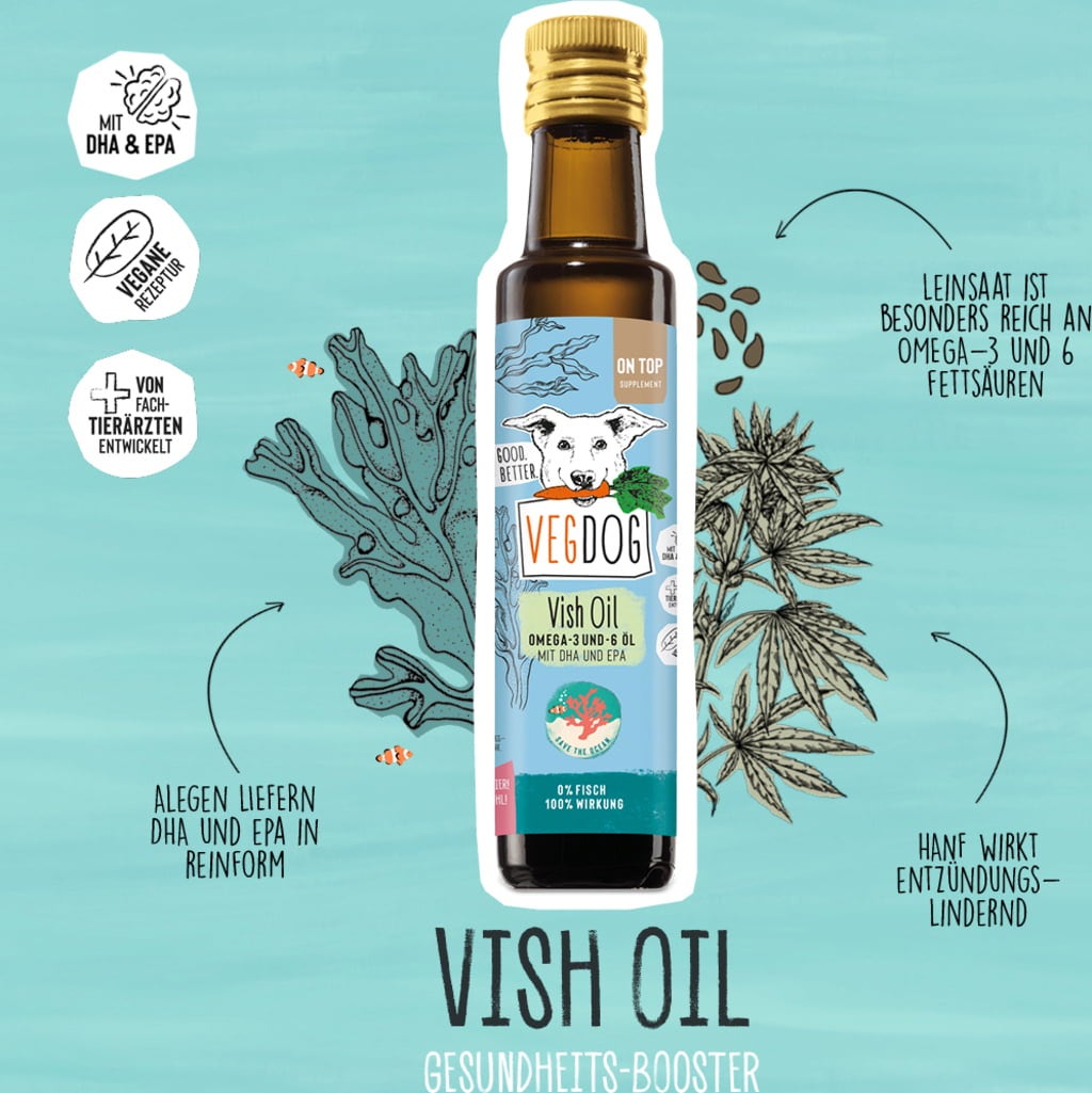 La Vish Oil de VEGDOG est une alternative végane à l'huile de poisson disponible sur le marché. Au lieu d'une source animale, seules des matières premières végétales telles que l'huile de chanvre, d'algues et de lin sont utilisées pour la production de cette huile. Celles-ci sont non seulement riches en acides gras oméga-3 et oméga-6, mais aussi beaucoup plus durables, respectueuses des animaux et de l'environnement que l'huile de poisson.