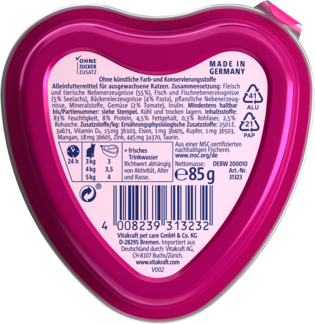 Un aliment principal pour chats préparé avec le cœur ! Chaque barquette en forme de cœur contient des ingrédients soigneusement sélectionnés, préparés avec le plus grand soin et au goût délicieux pour votre félin. En plus d’être particulièrement apprécié, cet aliment couvre l’ensemble des besoins nutritionnels et physiologiques de votre chat.