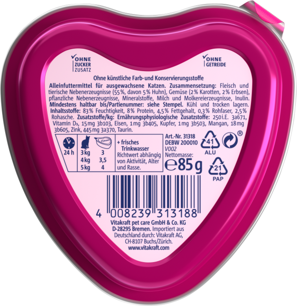 Un aliment principal pour chats préparé avec le cœur ! Chaque barquette en forme de cœur contient des ingrédients soigneusement sélectionnés, préparés avec le plus grand soin et au goût délicieux pour votre félin. En plus d’être particulièrement apprécié, cet aliment couvre l’ensemble des besoins nutritionnels et physiologiques de votre chat.