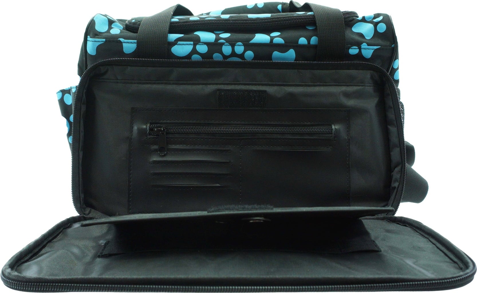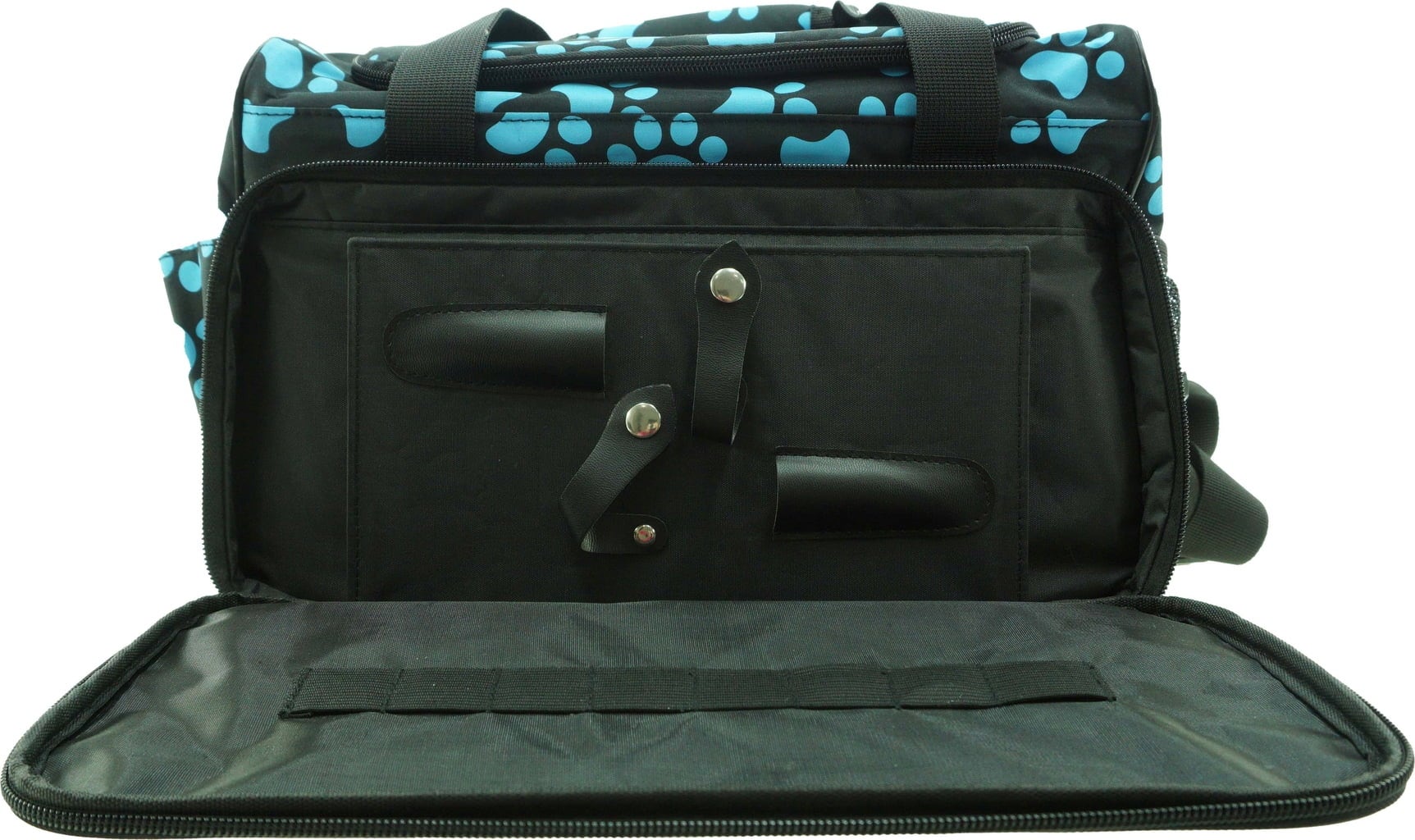 Ce sac pratique et polyvalent est parfait pour organiser les accessoires de toilettage de votre animal. Il dispose d'une grande section principale et de deux compartiments supplémentaires non verrouillables pour ranger brosses, tondeuses et autres accessoires. À l'extérieur, des poches supplémentaires offrent suffisamment d'espace pour les petits objets. Une des poches extérieures est équipée d'un porte-ciseaux, une autre est zippée, et les poches en filet permettent d'avoir les indispensables à portée de main.