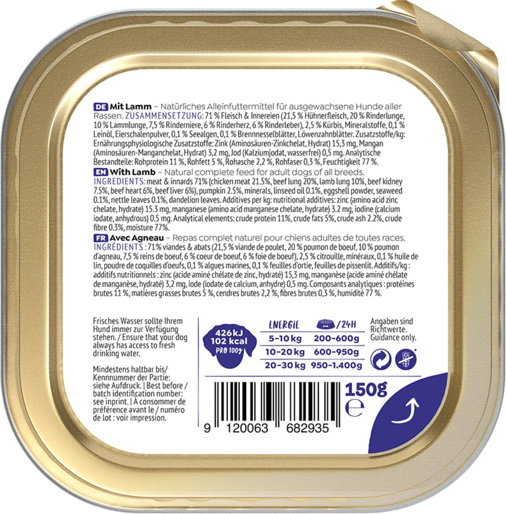 71 % viandes et abats (21,5 % viande de poulet, 20 % poumon de boeuf, 10 % poumon d'agneau, 7,5 % rognon de bœuf, 6 % coeurs de boeuf, 6 % foie de boeuf), 2,5 % courge, Mineralstoffe, 0,1 % Leinöl, poudre de coquilles d'œufs, 0,1 % Seealgenpulver, 0,1 % feuilles d'ortie, feuilles de pissenlit