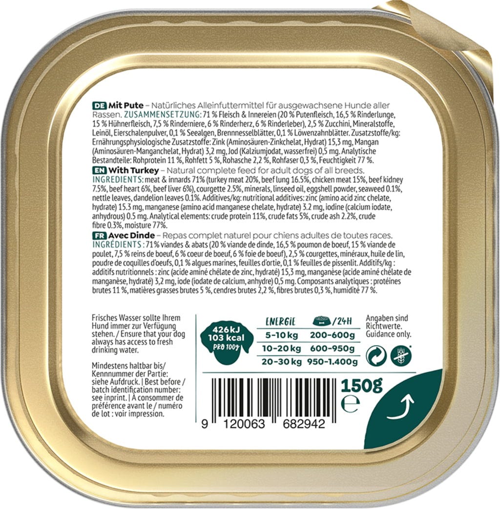 ADULT à la dinde, aux courgettes et au pissenlit convient aux chiens adultes de toutes races et de toutes tailles. Cet aliment principal contient 71 % de viande et est subtilement complété par des légumes et des herbes. Sa recette est totalement exempte d’OGM et de céréales.